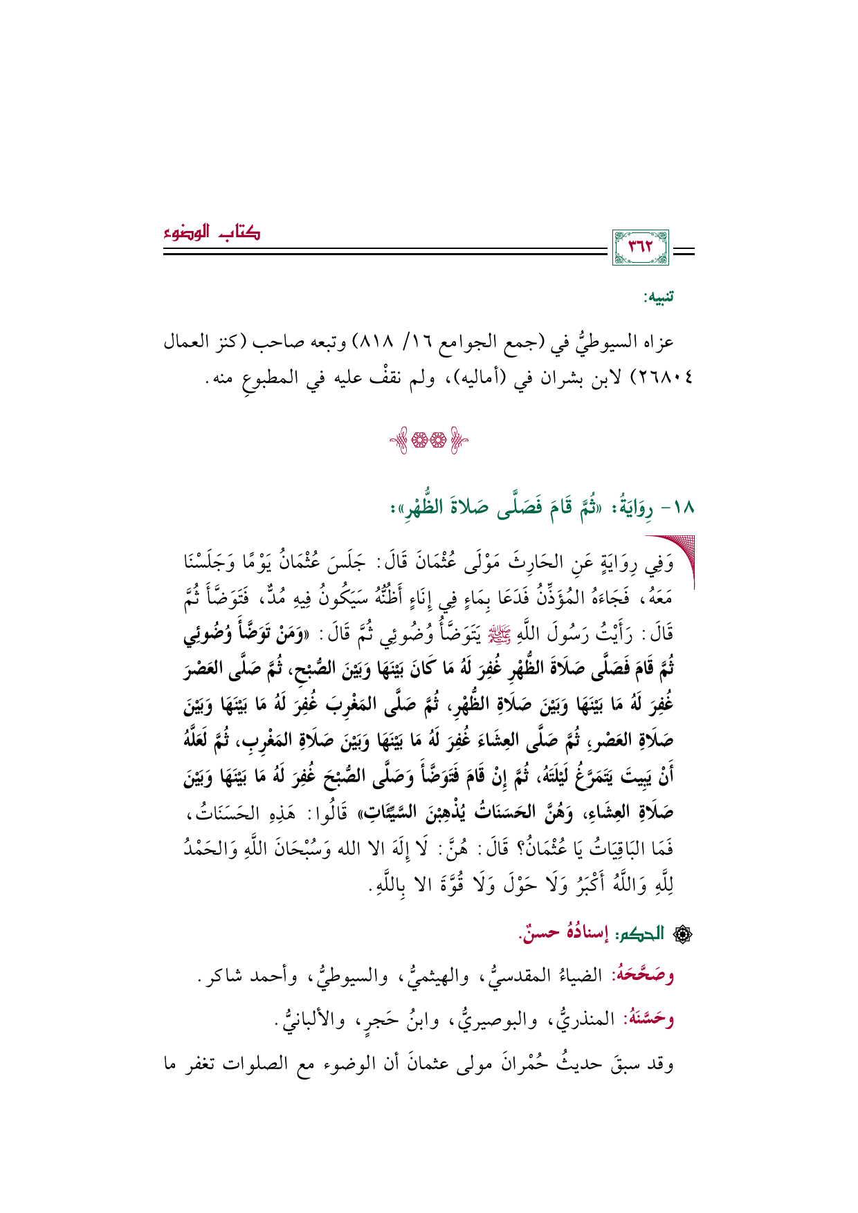 • وَفِي رِوَايَةٍ عَنِ الحَارِثَ مَوْلَى عُثْمَانَ قَالَ: جَلَسَ عُثْمَانُ يَوْمًا وَجَلَسْنَا مَعَهُ، فَجَاءَهُ المُؤَذِّنُ فَدَعَا بِمَاءٍ فِي إِنَاءٍ أَظُنُّهُ سَيَكُونُ فِيهِ مُدٌّ، فَتَوَضَّأَ ثُمَّ قَالَ: رَأَيْتُ رَسُولَ اللَّهِ صلى الله عليه وسلم يَتَوَضَّأُ وُضُوئِي ثُمَّ قَالَ: «وَمَنْ تَوَضَّأَ وُضُوئِي ثُمَّ قَامَ فَصَلَّى صَلَاةَ الظُّهْرِ غُفِرَ لَهُ مَا كَانَ بَيْنَهَا وَبَيْنَ الصُّبْحِ، ثُمَّ صَلَّى العَصْرَ غُفِرَ لَهُ مَا بَيْنَهَا وَبَيْنَ صَلَاةِ الظُّهْرِ، ثُمَّ صَلَّى المَغْرِبَ غُفِرَ لَهُ مَا بَيْنَهَا وَبَيْنَ صَلَاةِ العَصْر، ثُمَّ صَلَّى العِشَاءَ غُفِرَ لَهُ مَا بَيْنَهَا وَبَيْنَ صَلَاةِ المَغْرِبِ، ثُمَّ لَعَلَّهُ أَنْ يَبِيتَ يَتَمَرَّغُ لَيْلَتَهُ، ثُمَّ إِنْ قَامَ فَتَوَضَّأَ وَصَلَّى الصُّبْحَ غُفِرَ لَهُ مَا بَيْنَهَا وَبَيْنَ صَلَاةِ العِشَاءِ، وَهُنَّ الحَسَنَاتُ يُذْهِبْنَ السَّيِّئَاتِ» قَالُوا: هَذِهِ الحَسَنَاتُ، فَمَا البَاقِيَاتُ يَا عُثْمَانُ؟ قَالَ: هُنَّ: لَا إِلَهَ الا الله وَسُبْحَانَ اللَّهِ وَالحَمْدُ لِلَّهِ وَاللَّهُ أَكْبَرُ وَلَا حَوْلَ وَلَا قُوَّةَ الا بِاللَّهِ.
