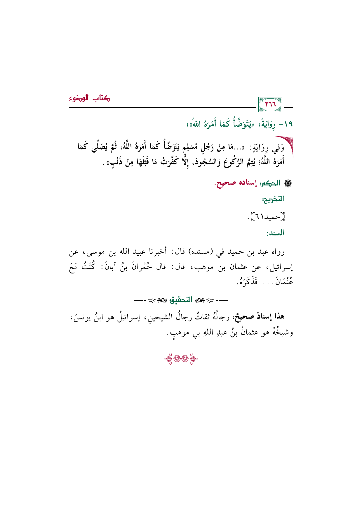 رواه عبد بن حميد في (مسنده) قال: أخبرنا عبيد الله بن موسى، عن إسرائيل، عن عثمان بن موهب، قال: قال حُمْرانَ بنُ أبانَ: كُنْتُ مَعَ عُثْمَانَ ... فَذَكَرَهُ.