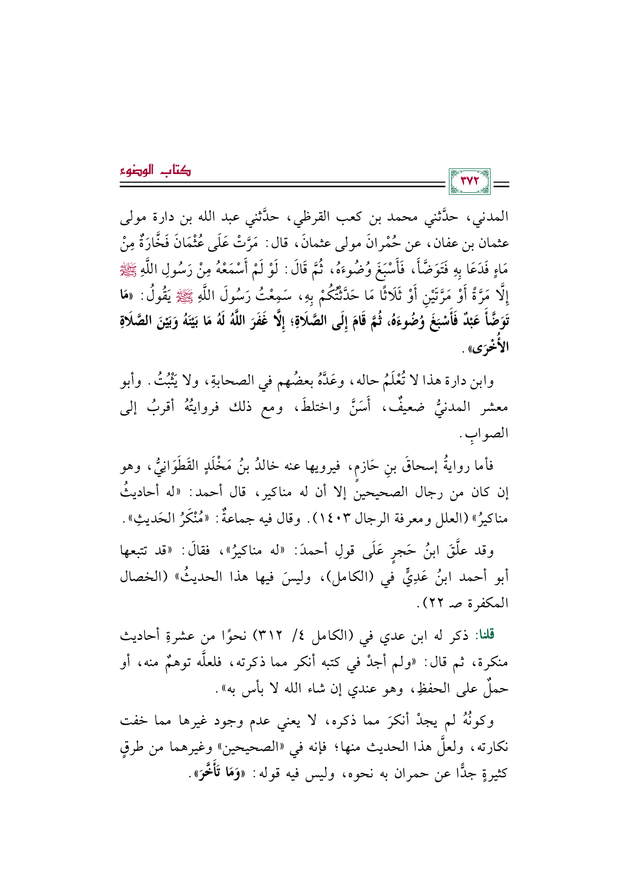 المدني، حدَّثني محمد بن كعب القرظي، حدَّثني عبد الله بن دارة مولى عثمان بن عفان، عن حُمْرانَ مولى عثمانَ، قال: مَرَّتْ عَلَى عُثْمَانَ فَخَّارَةٌ مِنْ مَاءٍ فَدَعَا بِهِ فَتَوَضَّأَ، فَأَسْبَغَ وُضُوءَهُ، ثُمَّ قَالَ: لَوْ لَمْ أَسْمَعْهُ مِنْ رَسُولِ اللَّهِ صلى الله عليه وسلم إِلَّا مَرَّةً أَوْ مَرَّتَيْنِ أَوْ ثَلَاثًا مَا حَدَّثْتُكُمْ بِهِ، سَمِعْتُ رَسُولَ اللَّهِ صلى الله عليه وسلم يَقُولُ: «مَا تَوَضَّأَ عَبْدٌ فَأَسْبَغَ وُضُوءَهُ، ثُمَّ قَامَ إِلَى الصَّلَاةِ؛ إِلَّا غَفَرَ اللَّهُ لَهُ مَا بَيْنَهُ وَبَيْنَ الصَّلَاةِ الأُخْرَى».