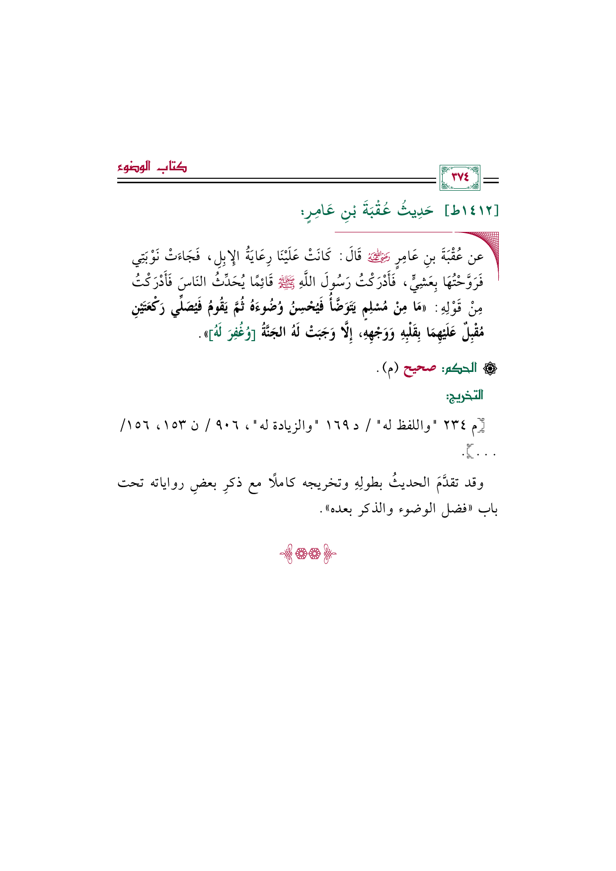◼ عن عُقْبَةَ بنِ عَامِرٍ رضي الله عنه قَالَ: كَانَتْ عَلَيْنَا رِعَايَةُ الإِبِلِ، فَجَاءَتْ نَوْبَتِي فَرَوَّحْتُهَا بِعَشِيٍّ، فَأَدْرَكْتُ رَسُولَ اللَّهِ صلى الله عليه وسلم قَائِمًا يُحَدِّثُ النَاسَ فَأَدْرَكْتُ مِنْ قَوْلِهِ: «مَا مِنْ مُسْلِمٍ يَتَوَضَّأُ فَيُحْسِنُ وُضُوءَهُ ثُمَّ يَقُومُ فَيُصَلِّي رَكْعَتَيْنِ مُقْبِلٌ عَلَيْهِمَا بِقَلْبِهِ وَوَجْهِهِ، إِلَّا وَجَبَتْ لَهُ الجَنَّةُ [وُغُفِرَ لَهُ]».