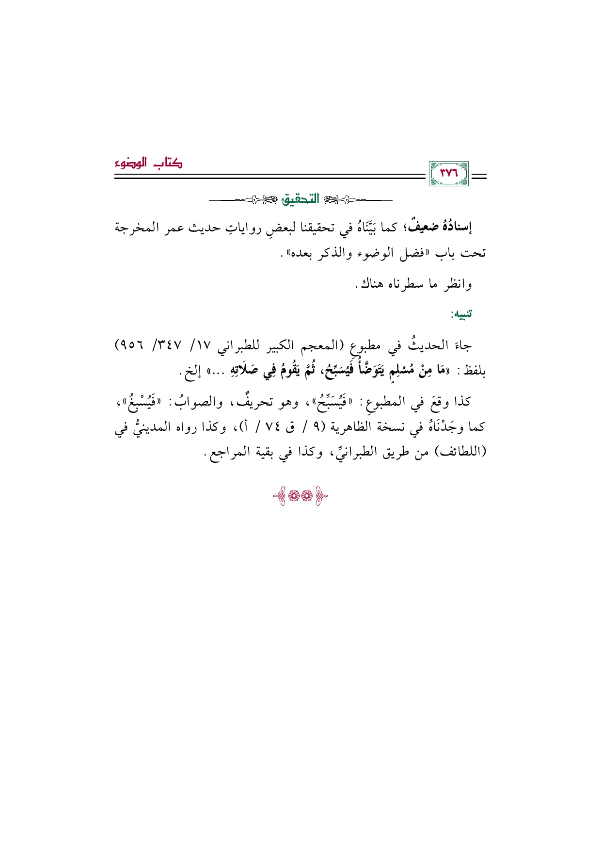 جاءَ الحديثُ في مطبوعِ (المعجم الكبير للطبراني ١٧/ ٣٤٧/ ٩٥٦) بلفظ: «مَا مِنْ مُسْلِمٍ يَتَوَضَّأُ فَيُسَبِّحُ، ثُمَّ يَقُومُ فِي صَلَاتِهِ ... » إلخ.