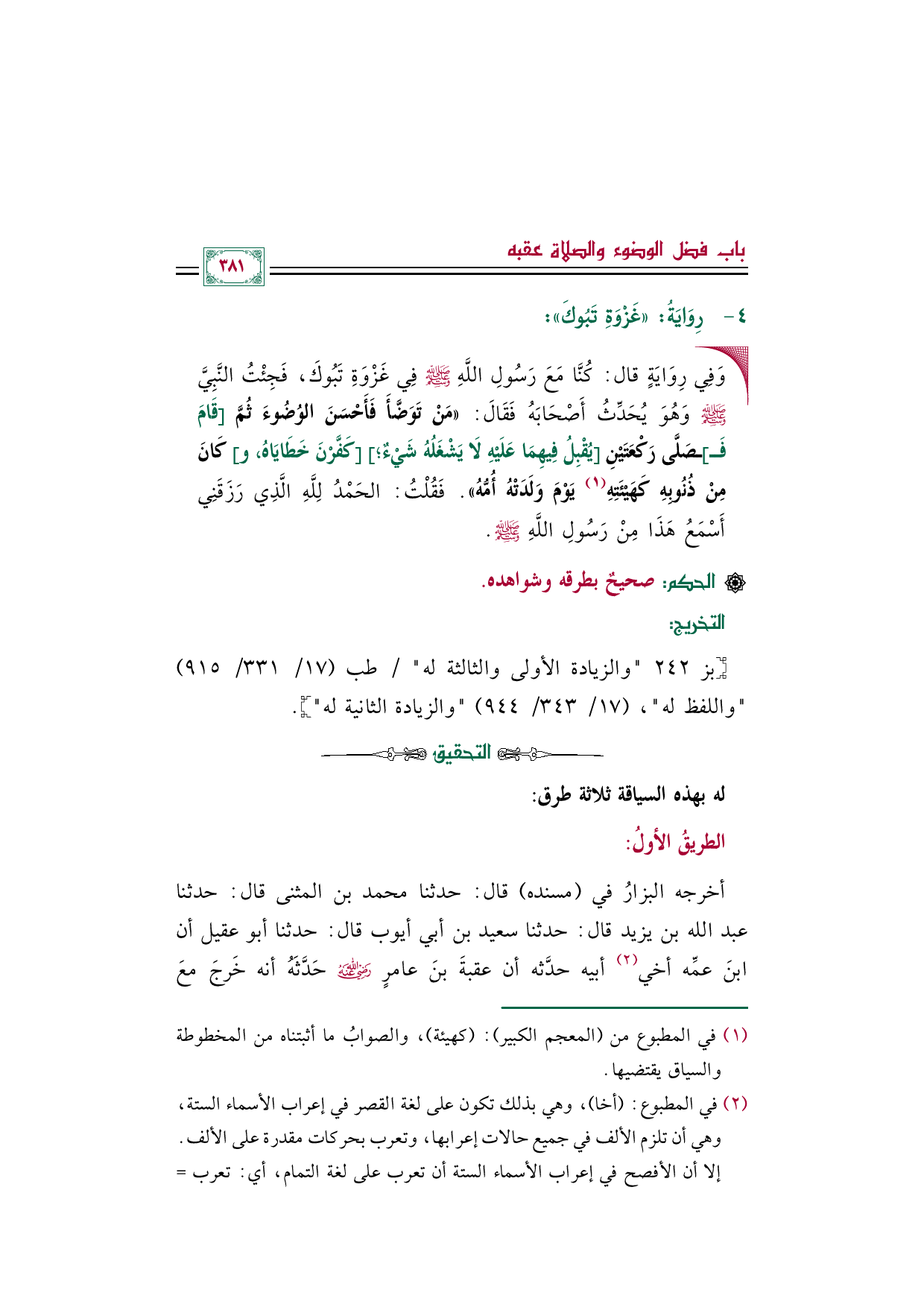 • وَفِي رِوَايَةٍ قال: كُنَّا مَعَ رَسُولِ اللَّهِ صلى الله عليه وسلم فِي غَزْوَةِ تَبُوكَ، فَجِئْتُ النَّبِيَّ صلى الله عليه وسلم وَهُوَ يُحَدِّثُ أَصْحَابَهُ فَقَالَ: «مَنْ تَوَضَّأَ فَأَحْسَنَ الوُضُوءَ ثُمَّ [قَامَ فَـ]ـصَلَّى رَكْعَتَيْنِ [يُقْبِلُ فِيهِمَا عَلَيْهِ لَا يَشْغَلُهُ شَيْءٌ؛] [كَفَّرْنَ خَطَايَاهُ، و] كَانَ مِنْ ذُنُوبِهِ كَهَيْئَتِهِ (¬١) يَوْمَ وَلَدَتْهُ أُمُّهُ». فَقُلْتُ: الحَمْدُ لِلَّهِ الَّذِي رَزَقَنِي أَسْمَعُ هَذَا مِنْ رَسُولِ اللَّهِ صلى الله عليه وسلم.