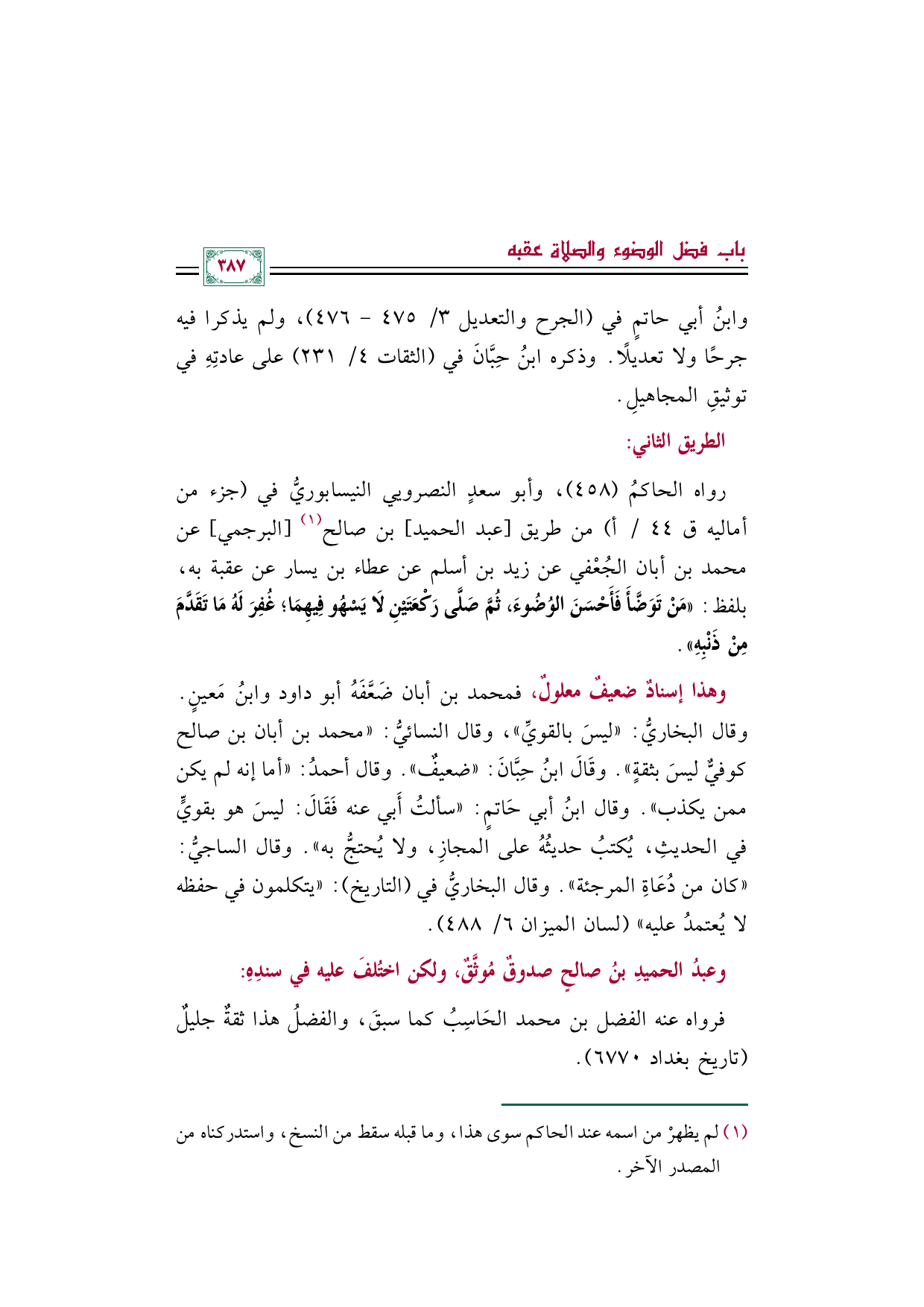 رواه الحاكمُ (٤٥٨)، وأبو سعدٍ النصرويي النيسابوريُّ في (جزء من أماليه ق ٤٤/ أ) من طريق [عبد الحميد] بن صالح (¬١) [البرجمي] عن محمد بن أبان الجُعْفي عن زيد بن أسلم عن عطاء بن يسار عن عقبة به، بلفظ: «مَنْ تَوَضَّأَ فَأَحْسَنَ الوُضُوءَ، ثُمَّ صَلَّى رَكْعَتَيْنِ لَا يَسْهُو فِيهِمَا؛ غُفِرَ لَهُ مَا تَقَدَّمَ مِنْ ذَنْبِهِ».