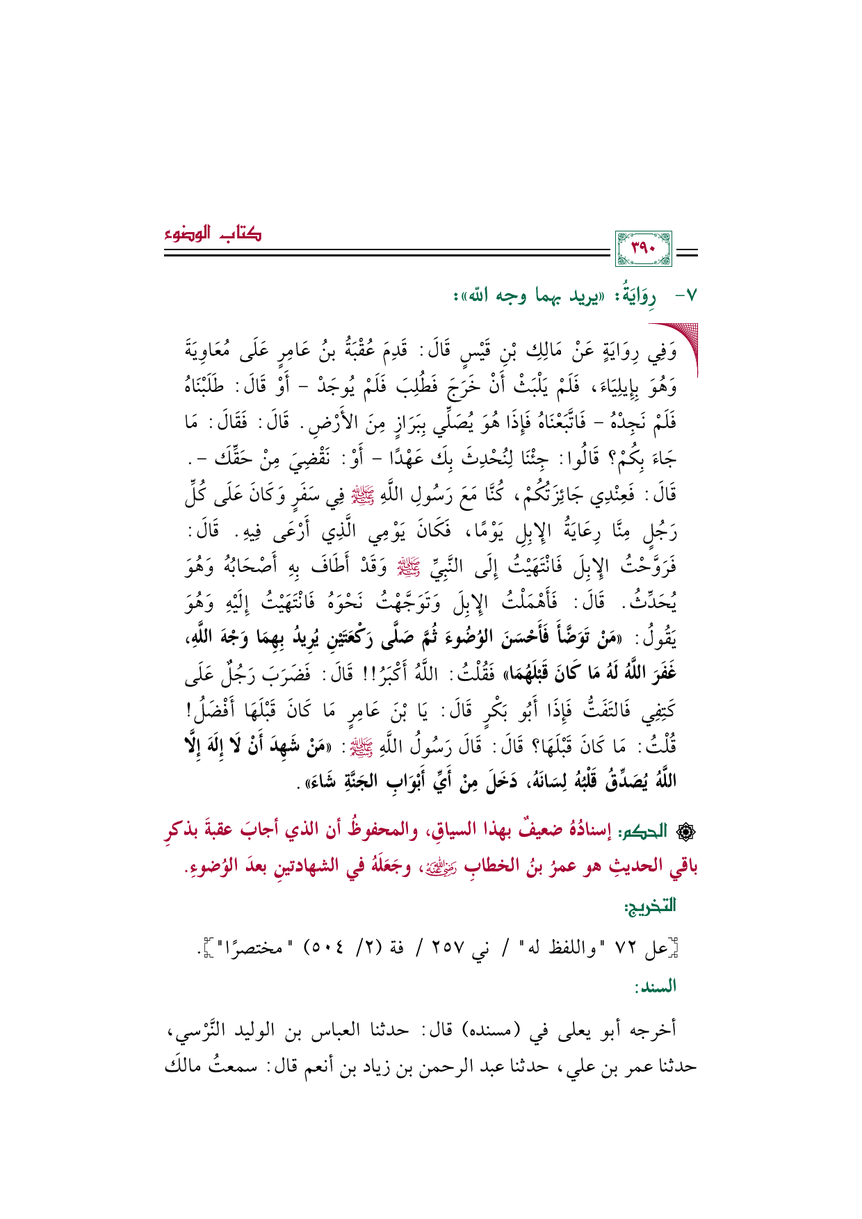 • وَفِي رِوَايَةٍ عَنْ مَالِكِ بْنِ قَيْسٍ قَالَ: قَدِمَ عُقْبَةُ بنُ عَامِرٍ عَلَى مُعَاوِيَةَ وَهُوَ بِإِيلِيَاءَ، فَلَمْ يَلْبَثْ أَنْ خَرَجَ فَطُلِبَ فَلَمْ يُوجَدْ -أَوْ قَالَ: طَلَبْنَاهُ فَلَمْ نَجِدْهُ- فَاتَّبَعْنَاهُ فَإِذَا هُوَ يُصَلِّي بِبَرَازٍ مِنَ الأَرْضِ. قَالَ: فَقَالَ: مَا جَاءَ بِكُمْ؟ قَالُوا: جِئْنَا لِنُحْدِثَ بِكَ عَهْدًا -أَوْ: نَقْضِيَ مِنْ حَقِّكَ-. قَالَ: فَعِنْدِي جَائِزَتُكُمْ، كُنَّا مَعَ رَسُولِ اللَّهِ صلى الله عليه وسلم فِي سَفَرٍ وَكَانَ عَلَى كُلِّ رَجُلٍ مِنَّا رِعَايَةُ الإِبِلِ يَوْمًا، فَكَانَ يَوْمِي الَّذِي أَرْعَى فِيهِ. قَالَ: فَرَوَّحْتُ الإِبِلَ فَانْتَهَيْتُ إِلَى النَّبِيِّ صلى الله عليه وسلم وَقَدْ أَطَافَ بِهِ أَصْحَابُهُ وَهُوَ يُحَدِّثُ. قَالَ: فَأَهْمَلْتُ الإِبِلَ وَتَوَجَّهْتُ نَحْوَهُ فَانْتَهَيْتُ إِلَيْهِ وَهُوَ يَقُولُ: «مَنْ تَوَضَّأَ فَأَحْسَنَ الوُضُوءَ ثُمَّ صَلَّى رَكْعَتَيْنِ يُرِيدُ بِهِمَا وَجْهَ اللَّهِ، غَفَرَ اللَّهُ لَهُ مَا كَانَ قَبْلَهُمَا» فَقُلْتُ: اللَّهُ أَكْبَرُ!! قَالَ: فَضَرَبَ رَجُلٌ عَلَى كَتِفِي فَالتَفَتُّ فَإِذَا أَبُو بَكْرٍ قَالَ: يَا بْنَ عَامِرٍ مَا كَانَ قَبْلَهَا أَفْضَلُ! قُلْتُ: مَا كَانَ قَبْلَهَا؟ قَالَ: قَالَ رَسُولُ اللَّهِ صلى الله عليه وسلم: «مَنْ شَهِدَ أَنْ لَا إِلَهَ إِلَّا اللَّهُ يُصَدِّقُ قَلْبُهُ لِسَانَهُ، دَخَلَ مِنْ أَيِّ أَبْوَابِ الجَنَّةِ شَاءَ».
