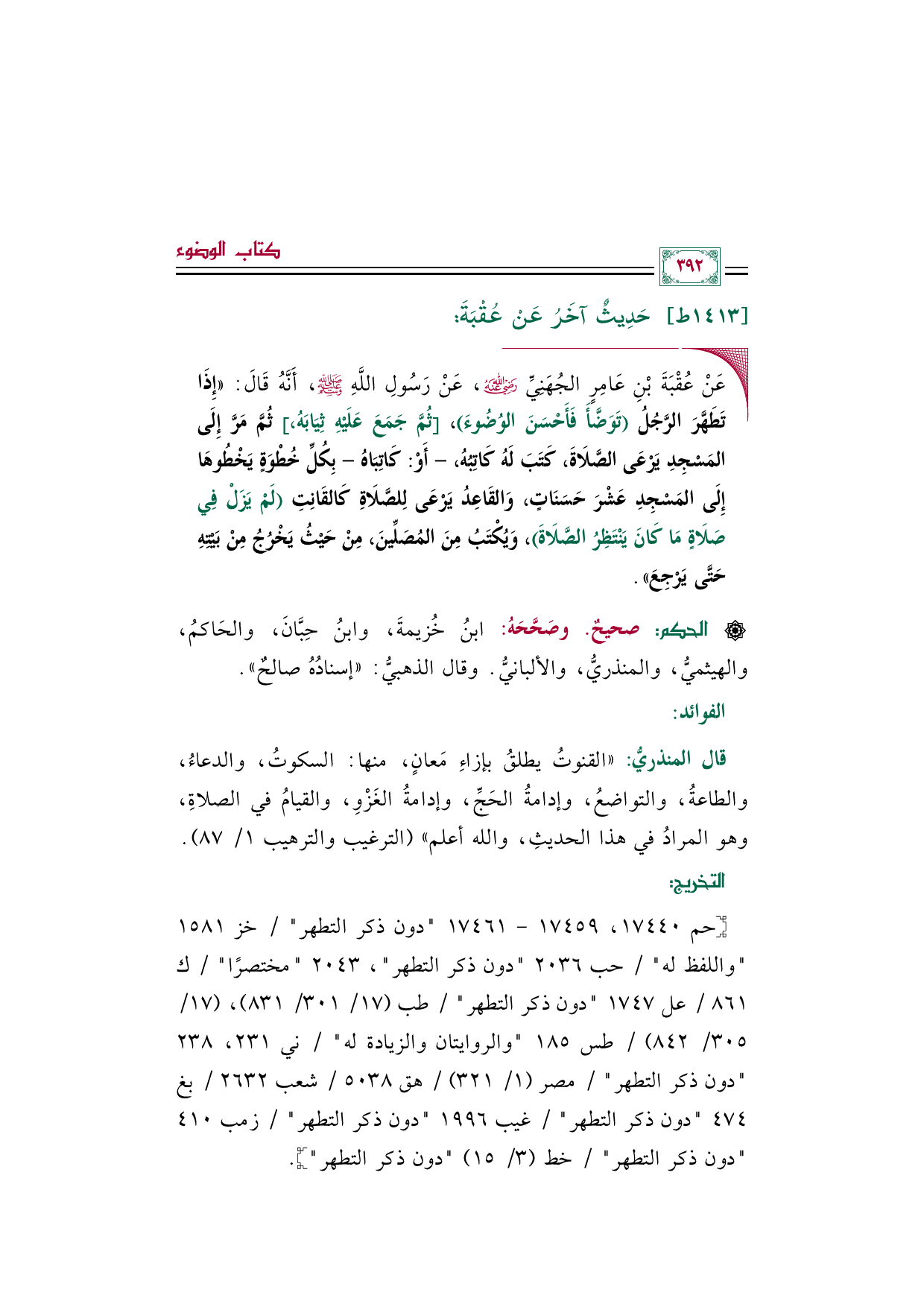 [حم ١٧٤٤٠، ١٧٤٥٩ - ١٧٤٦١ (دون ذكر التطهر) / خز ١٥٨١ (واللفظ له) / حب ٢٠٣٦ (دون ذكر التطهر)، ٢٠٤٣ (مختصرًا) / ك ٨٦١/ عل ١٧٤٧ (دون ذكر التطهر) / طب (١٧/ ٣٠١/ ٨٣١)، (١٧/ ٣٠٥/ ٨٤٢) / طس ١٨٥ (والروايتان والزيادة له) / ني ٢٣١، ٢٣٨ (دون ذكر التطهر) / مصر (١/ ٣٢١) / هق ٥٠٣٨/ شعب ٢٦٣٢/ بغ ٤٧٤ (دون ذكر التطهر) / غيب ١٩٩٦ (دون ذكر التطهر) / زمب ٤١٠ (دون ذكر التطهر) / خط (٣/ ١٥) (دون ذكر التطهر)].