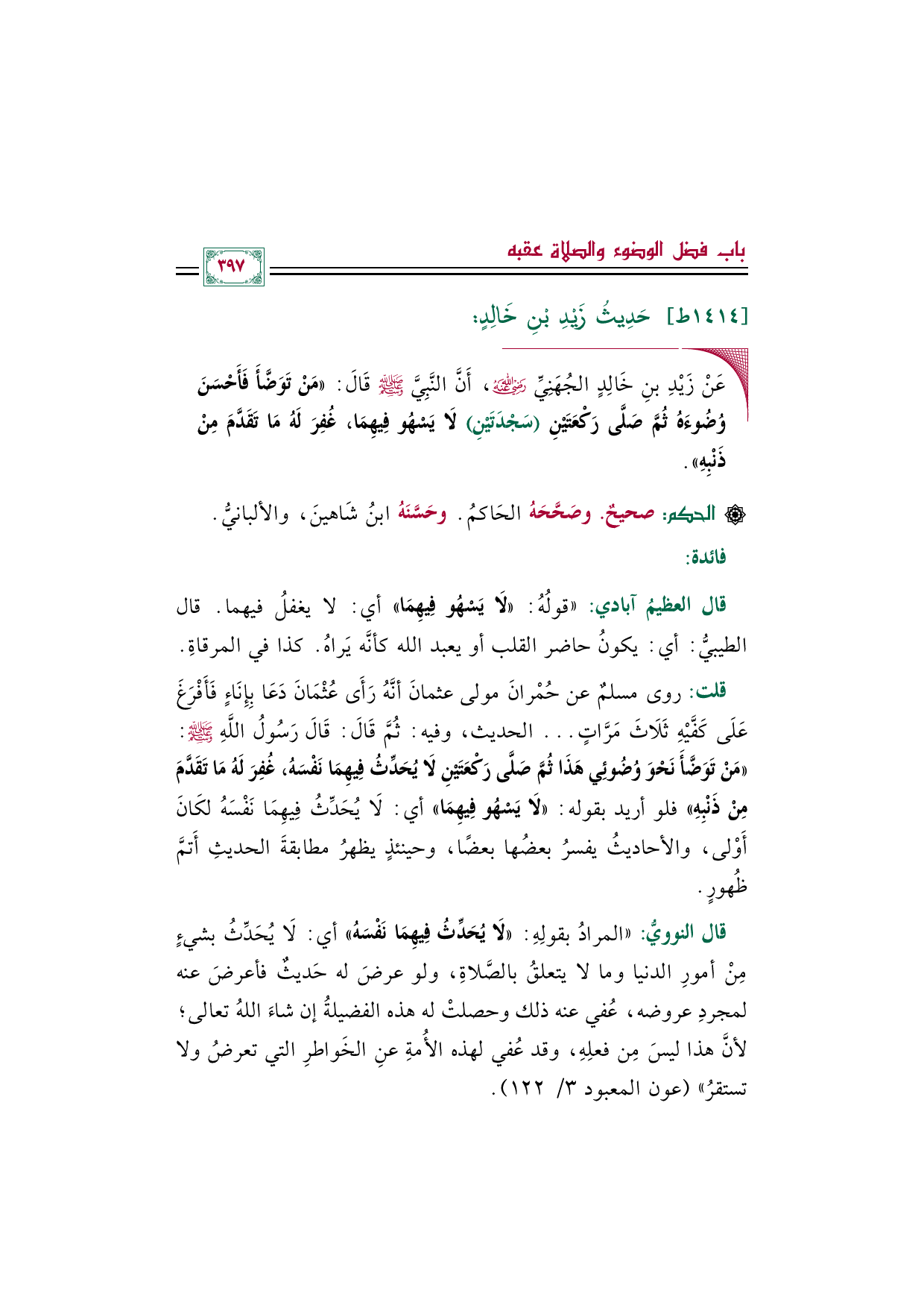 ◼ عَنْ زَيْدِ بنِ خَالِدٍ الجُهَنِيِّ رضي الله عنه، أَنَّ النَّبِيَّ صلى الله عليه وسلم قَالَ: «مَنْ تَوَضَّأَ فَأَحْسَنَ وُضُوءَهُ ثُمَّ صَلَّى رَكْعَتَيْنِ (سَجْدَتَيْنِ) لَا يَسْهُو فِيهِمَا، غُفِرَ لَهُ مَا تَقَدَّمَ مِنْ ذَنْبِهِ».