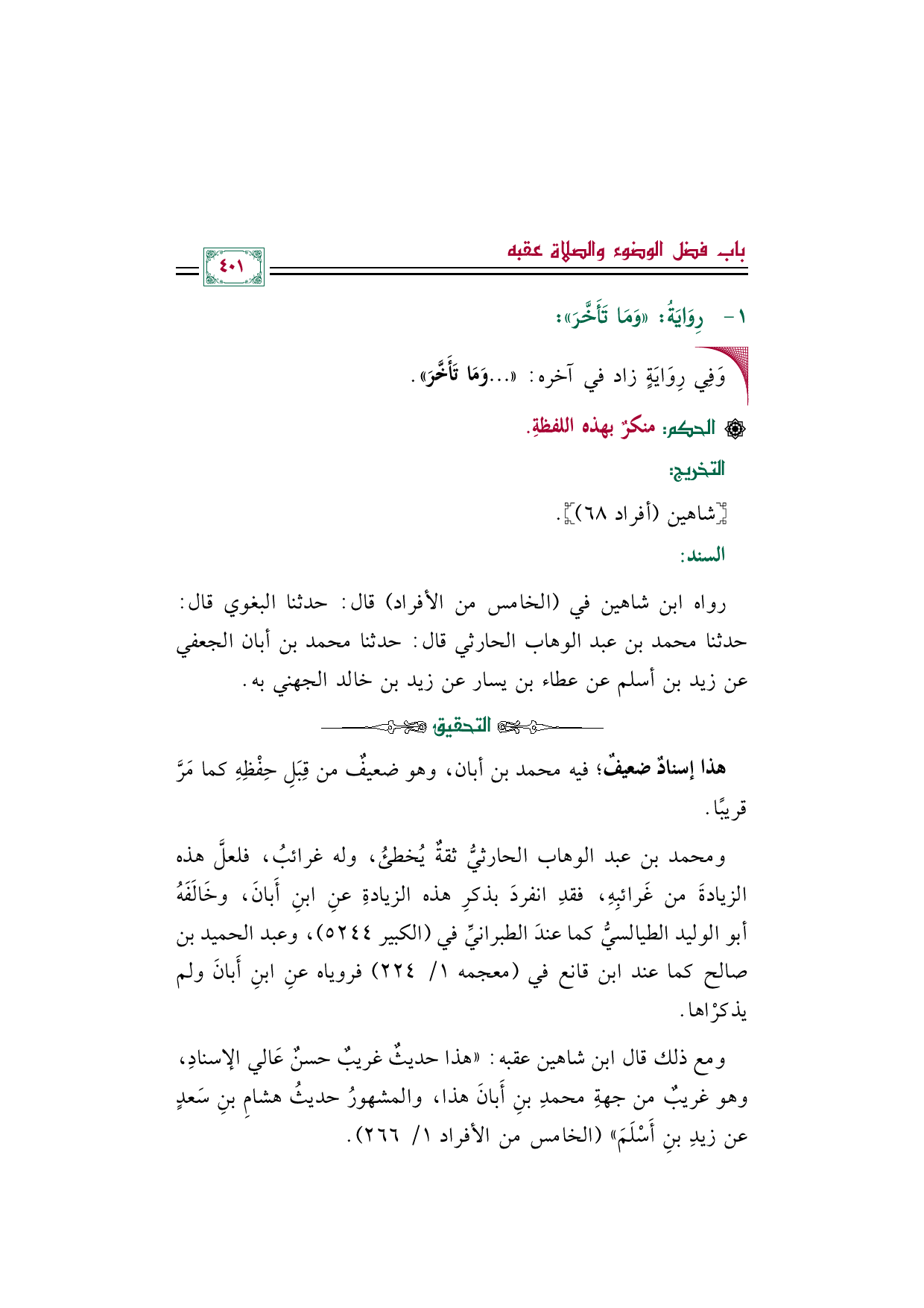 ومع ذلك قال ابن شاهين عقبه: "هذا حديثٌ غريبٌ حسنٌ عَالي الإسنادِ، وهو غريبٌ من جهةِ محمدِ بنِ أَبانَ هذا، والمشهورُ حديثُ هشامِ بنِ سَعدٍ عن زيدِ بنِ أَسْلَمَ" (الخامس من الأفراد ١/ ٢٦٦).