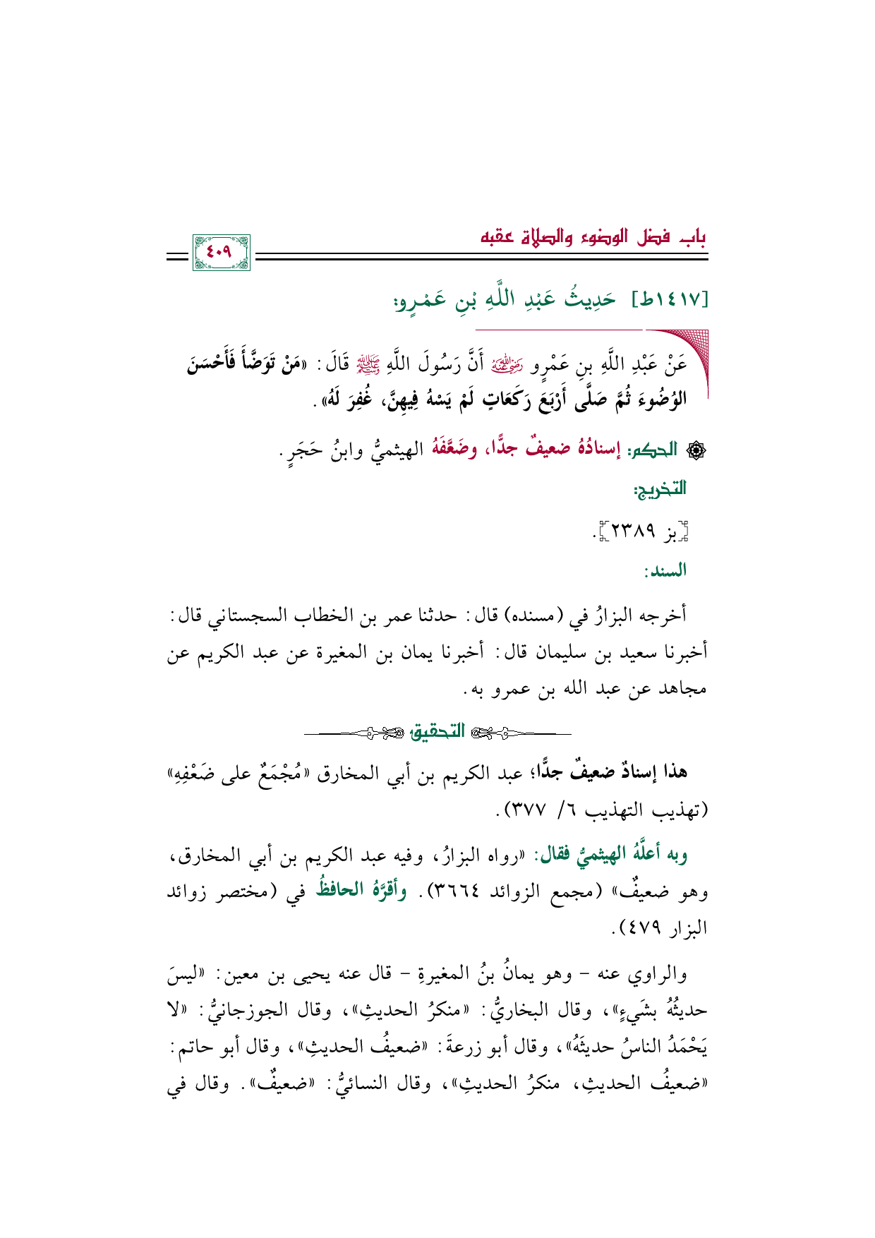 أخرجه البزارُ في (مسنده) قال: حدثنا عمر بن الخطاب السجستاني قال: أخبرنا سعيد بن سليمان قال: أخبرنا يمان بن المغيرة عن عبد الكريم عن مجاهد عن عبد الله بن عمرو به.