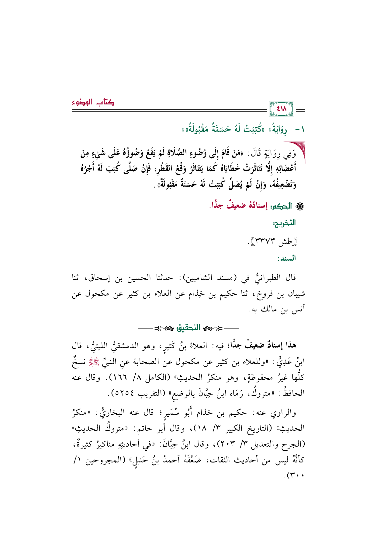 قال الطبرانيُّ في (مسند الشاميين): حدثنا الحسين بن إسحاق، ثنا شيبان بن فروخ، ثنا حكيم بن خِذام عن العلاء بن كثير عن مكحول عن أنس بن مالك به.