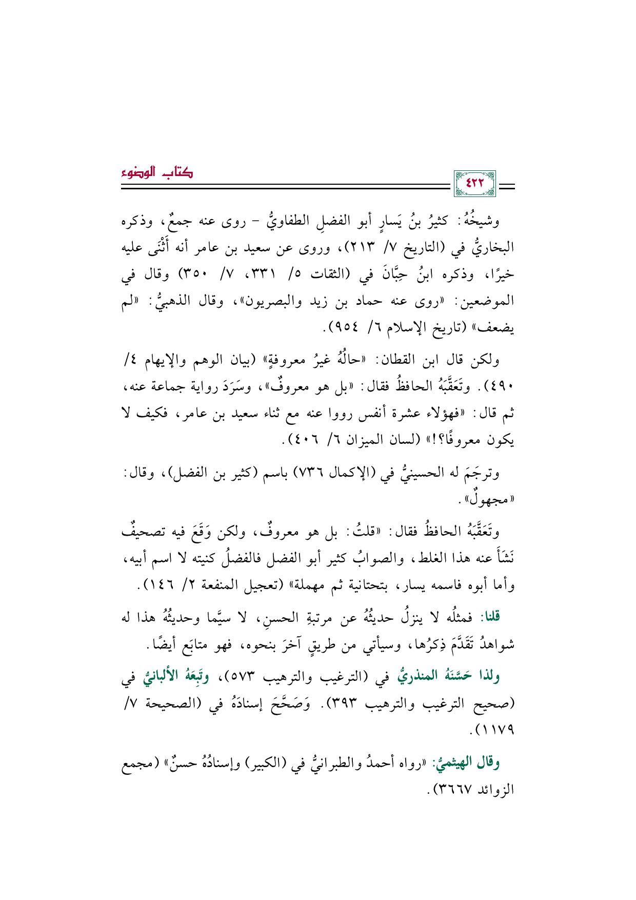 ولكن قال ابن القطان: "حالُهُ غيرُ معروفةٍ" (بيان الوهم والإيهام ٤/ ٤٩٠). وتَعَقَّبَهُ الحافظُ فقال: "بل هو معروفٌ"، وسَرَدَ رواية جماعة عنه، ثم قال: "فهؤلاء عشرة أنفس رووا عنه مع ثناء سعيد بن عامر، فكيف لا يكون معروفًا؟ ! " (لسان الميزان ٦/ ٤٠٦).