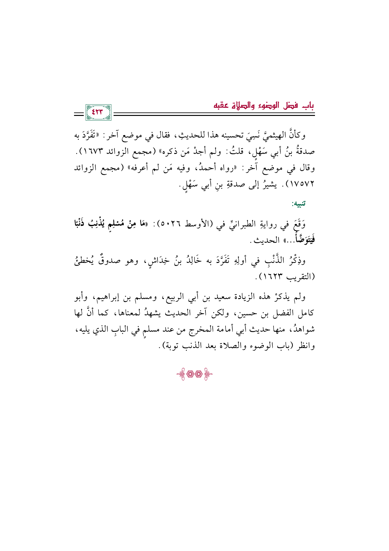 وكأنَّ الهيثميَّ نَسِيَ تحسينه هذا للحديثِ، فقال في موضع آخر: "تَفَرَّدَ به صدقةُ بنُ أبي سَهْلٍ، قلتُ: ولم أجدْ مَن ذكره" (مجمع الزوائد ١٦٧٣). وقال في موضع آخر: "رواه أحمدُ، وفيه مَن لم أعرفه" (مجمع الزوائد ١٧٥٧٢). يشيرُ إلى صدقةِ بنِ أبي سَهْلٍ.