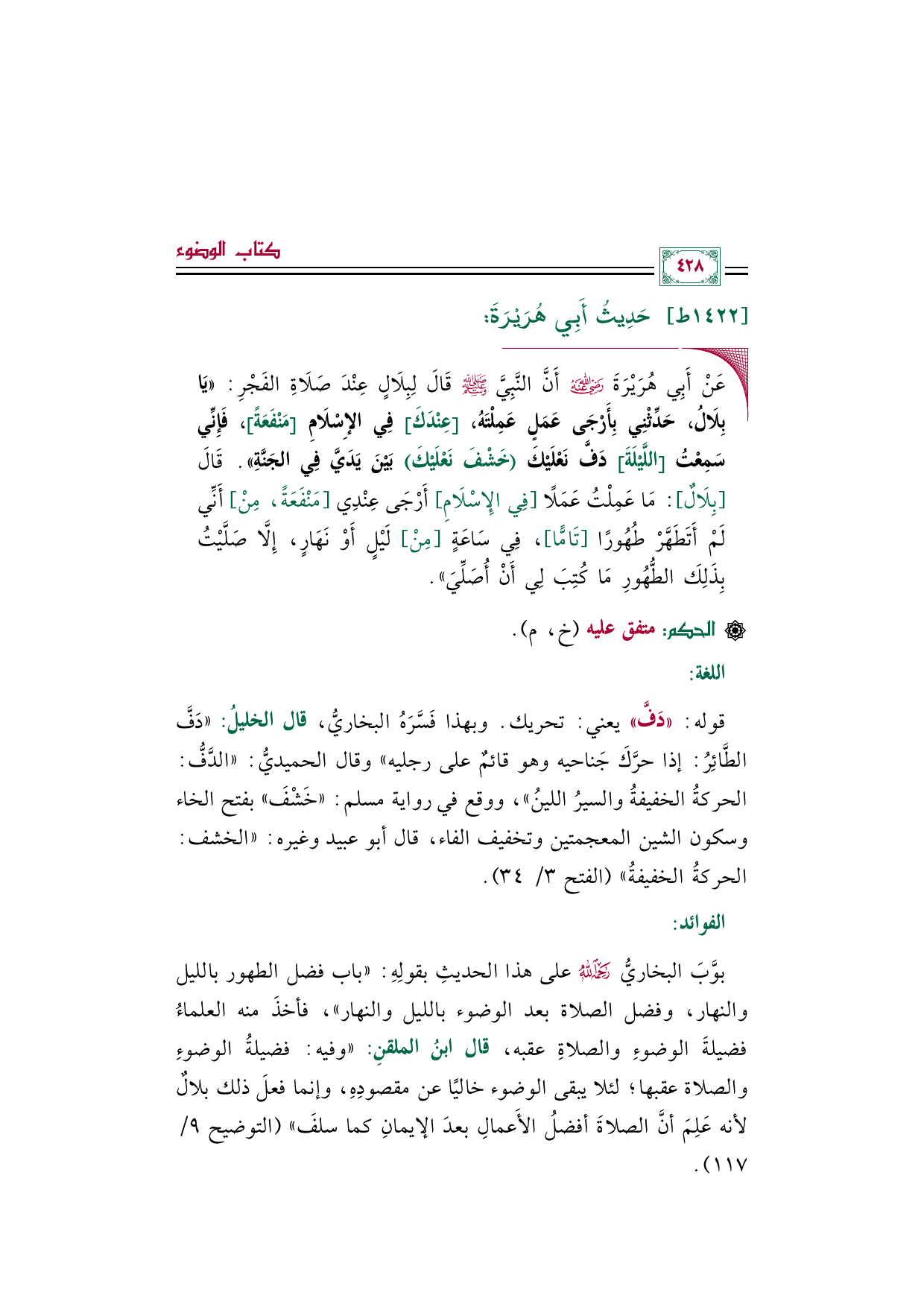 بوَّبَ البخاريُّ رحمه الله على هذا الحديثِ بقولِهِ: "باب فضل الطهور بالليل والنهار، وفضل الصلاة بعد الوضوء بالليل والنهار"، فأخذَ منه العلماءُ فضيلةَ الوضوءِ والصلاةِ عقبه، قال ابنُ الملقنِ: "وفيه: فضيلةُ الوضوءِ والصلاة عقبها؛ لئلا يبقى الوضوء خاليًا عن مقصودِهِ، وإنما فعلَ ذلك بلالٌ لأنه عَلِمَ أنَّ الصلاةَ أفضلُ الأَعمالِ بعدَ الإيمانِ كما سلفَ" (التوضيح ٩/ ١١٧).