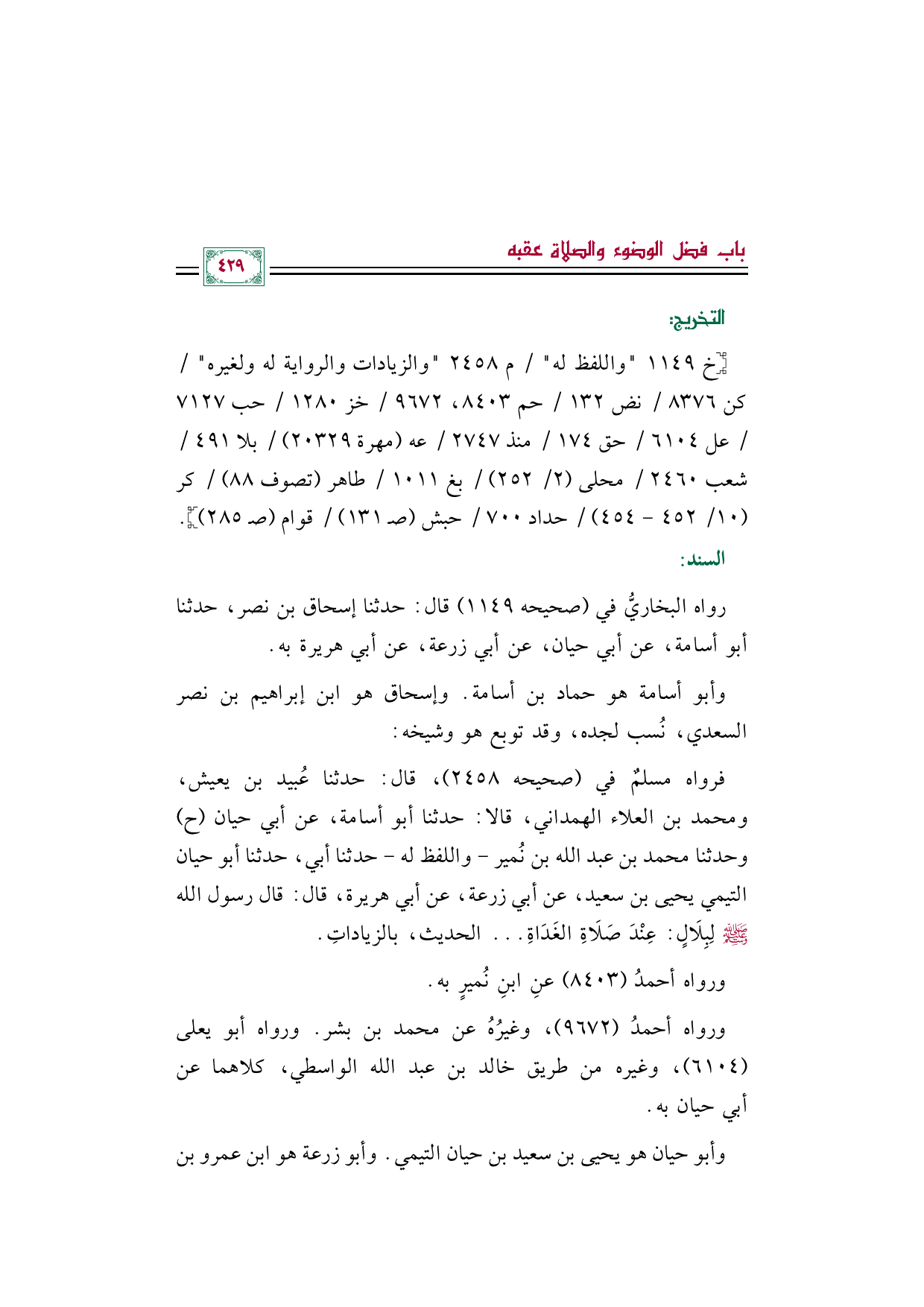 فرواه مسلمٌ في (صحيحه ٢٤٥٨)، قال: حدثنا عُبيد بن يعيش، ومحمد بن العلاء الهمداني، قالا: حدثنا أبو أسامة، عن أبي حيان (ح) وحدثنا محمد بن عبد الله بن نُمير -واللفظ له- حدثنا أبي، حدثنا أبو حيان التيمي يحيى بن سعيد، عن أبي زرعة، عن أبي هريرة، قال: قال رسول الله صلى الله عليه وسلم لِبِلَالٍ: عِنْدَ صَلَاةِ الغَدَاةِ ... الحديث، بالزياداتِ.