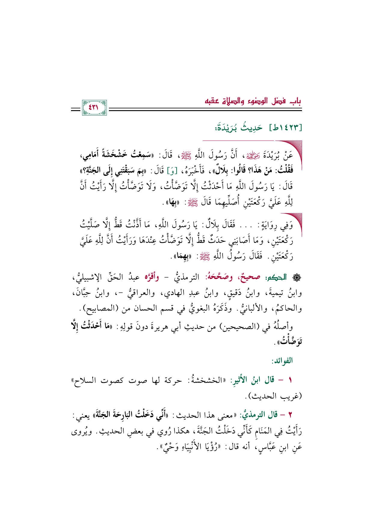 ◼ عَنْ بُرَيْدَةَ رضي الله عنه، أَنَّ رَسُولَ اللَّهِ صلى الله عليه وسلم، قَالَ: ((سَمِعْتُ خَشْخَشَةً أَمَامِي، فَقُلْتُ: مَنْ هَذَا؟ قَالُوا: بِلَالٌ))، فَأَخْبَرَهُ، [وَ] قَالَ: «بِمَ سَبَقْتَنِي إِلَى الجَنَّةِ؟ » قَالَ: يَا رَسُولَ اللَّهِ مَا أَحْدَثْتُ إِلَّا تَوَضَّأْتُ، وَلَا تَوَضَّأْتُ إِلَّا رَأَيْتُ أَنَّ لِلَّهِ عَلَيَّ رَكْعَتَيْنِ أُصَلِّيهِمَا قَالَ صلى الله عليه وسلم: «بِهَا».