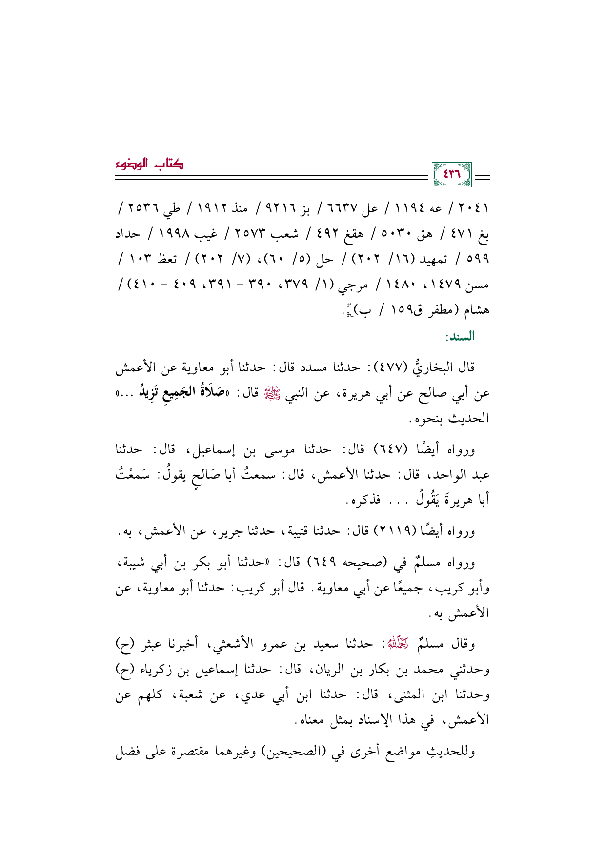 ورواه مسلمٌ في (صحيحه ٦٤٩) قال: "حدثنا أبو بكر بن أبي شيبة، وأبو كريب، جميعًا عن أبي معاوية. قال أبو كريب: حدثنا أبو معاوية، عن الأعمش به.