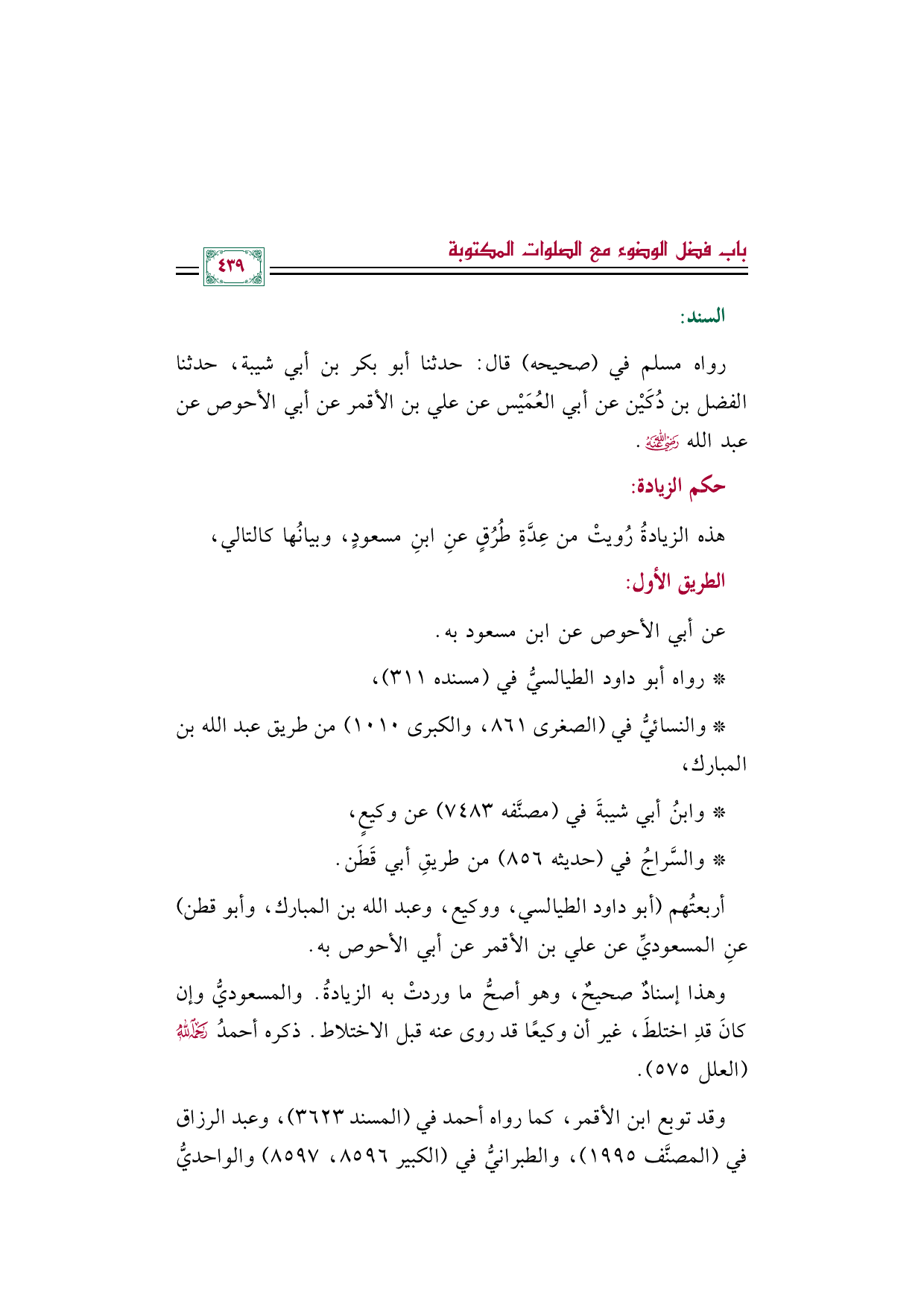 أربعتُهم (أبو داود الطيالسي، ووكيع، وعبد الله بن المبارك، وأبو قطن) عنِ المسعوديِّ عن علي بن الأقمر عن أبي الأحوص به.