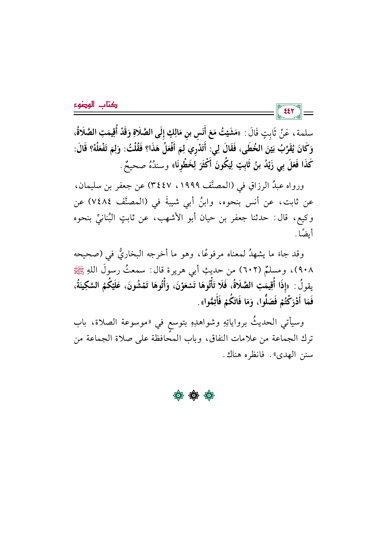 سلمة، عَنْ ثَابِتٍ قَالَ: ((مَشَيْتُ مَعَ أَنَسِ بنِ مَالِكٍ إِلَى الصَّلَاةِ وَقَدْ أُقِيمَتِ الصَّلَاةُ، وَكَانَ يُقَرِّبُ بَيْنَ الخُطَى، فَقَالَ لِي: أَتَدْرِي لِمَ أَفْعَلُ هَذَا؟ فَقُلْتُ: وَلِمَ تَفْعَلُهُ؟ قَالَ: كَذَا فَعَلَ بِي زَيْدُ بنُ ثَابِتٍ لِيَكُونَ أَكْثَرَ لِخَطْوِنَا)) وسندُهُ صحيحٌ.