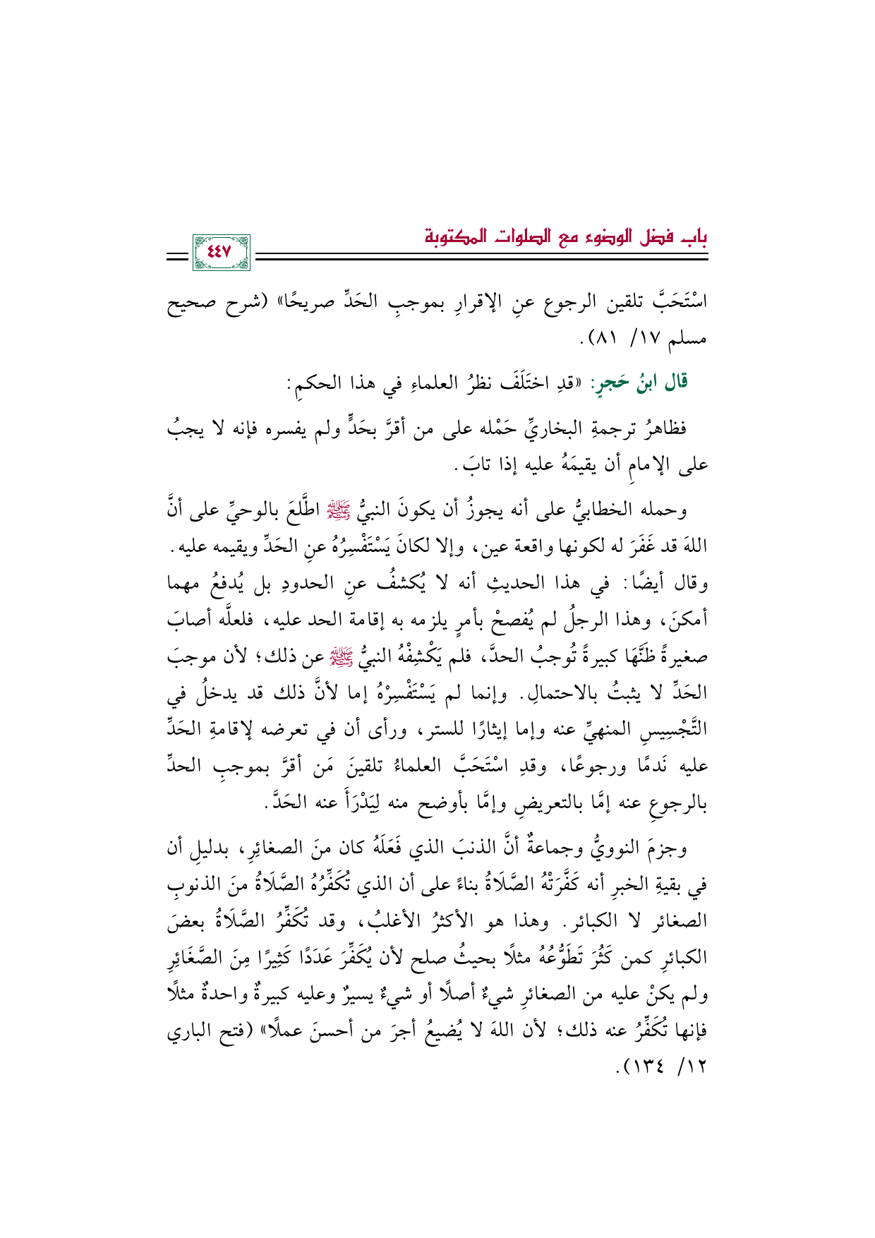 وجزمَ النوويُّ وجماعةٌ أنَّ الذنبَ الذي فَعَلَهُ كان منَ الصغائِرِ، بدليلِ أن في بقيةِ الخبرِ أنه كَفَّرَتْهُ الصَّلَاةُ بناءً على أن الذي تُكَفِّرُهُ الصَّلَاةُ منَ الذنوبِ الصغائر لا الكبائر. وهذا هو الأكثرُ الأغلبُ، وقد تُكَفِّرُ الصَّلَاةُ بعضَ الكبائرِ كمن كَثُرَ تَطَوُّعُهُ مثلًا بحيثُ صلح لأن يُكَفِّرَ عَدَدًا كَثِيرًا مِنَ الصَّغَائِرِ ولم يكنْ عليه من الصغائرِ شيءٌ أصلًا أو شيءٌ يسيرٌ وعليه كبيرةٌ واحدةٌ مثلًا فإنها تُكَفِّرُ عنه ذلك؛ لأن اللهَ لا يُضيعُ أجرَ من أحسنَ عملًا)) (فتح الباري ١٢/ ١٣٤).