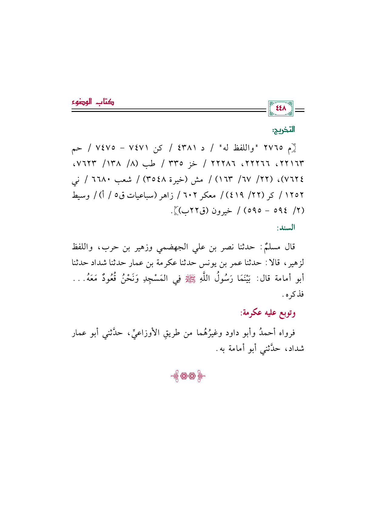 قال مسلمٌ: حدثنا نصر بن علي الجهضمي وزهير بن حرب، واللفظ لزهير، قالا: حدثنا عمر بن يونس حدثنا عكرمة بن عمار حدثنا شداد حدثنا أبو أمامة قال: بَيْنَمَا رَسُولُ اللَّهِ صلى الله عليه وسلم فِي المَسْجِدِ وَنَحْنُ قُعُودٌ مَعَهُ ... فذكره.