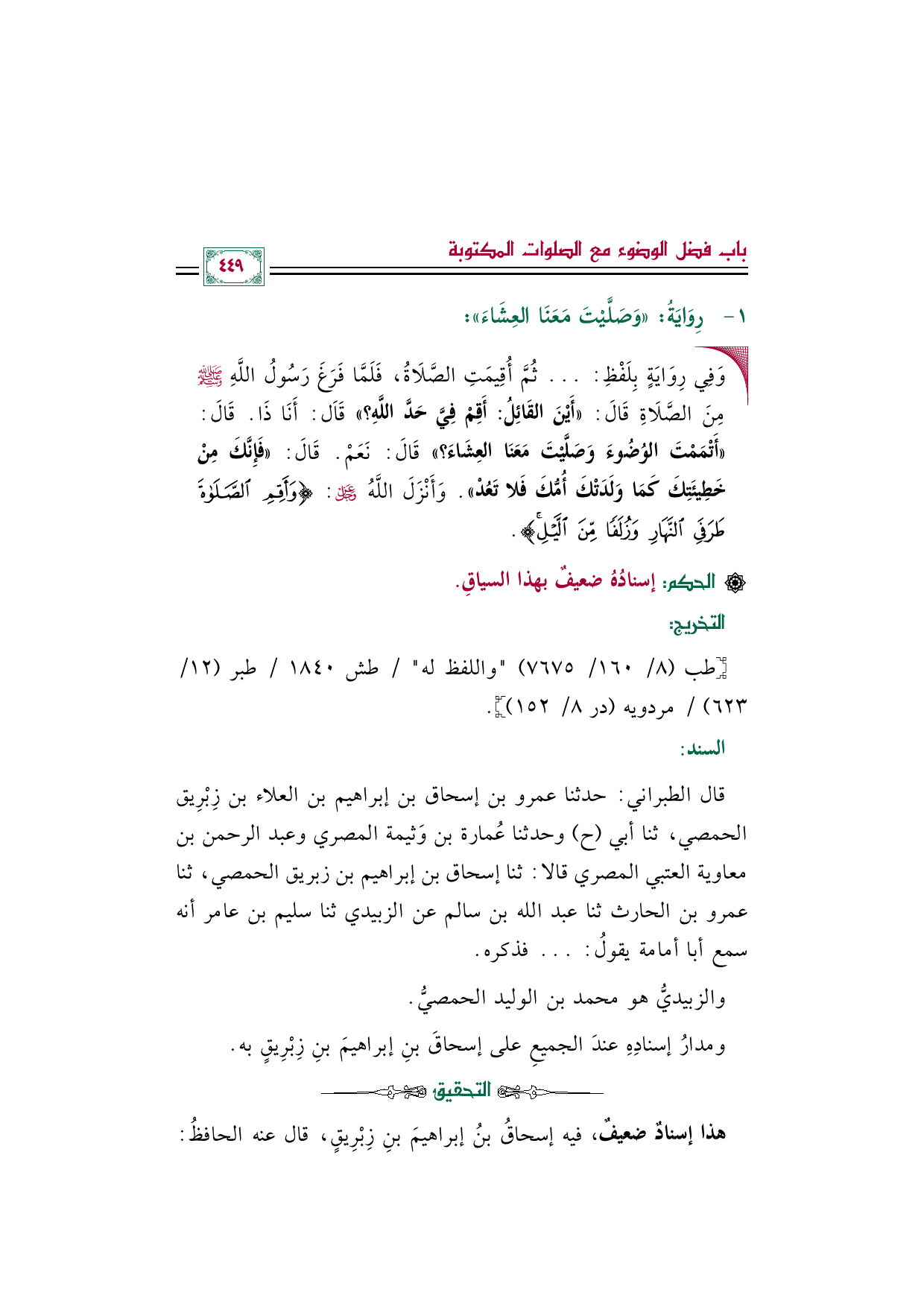 قال الطبراني: حدثنا عمرو بن إسحاق بن إبراهيم بن العلاء بن زِبْرِيق الحمصي، ثنا أبي (ح) وحدثنا عُمارة بن وَثيمة المصري وعبد الرحمن بن معاوية العتبي المصري قالا: ثنا إسحاق بن إبراهيم بن زبريق الحمصي، ثنا عمرو بن الحارث ثنا عبد الله بن سالم عن الزبيدي ثنا سليم بن عامر أنه سمع أبا أمامة يقولُ: ... فذكره.