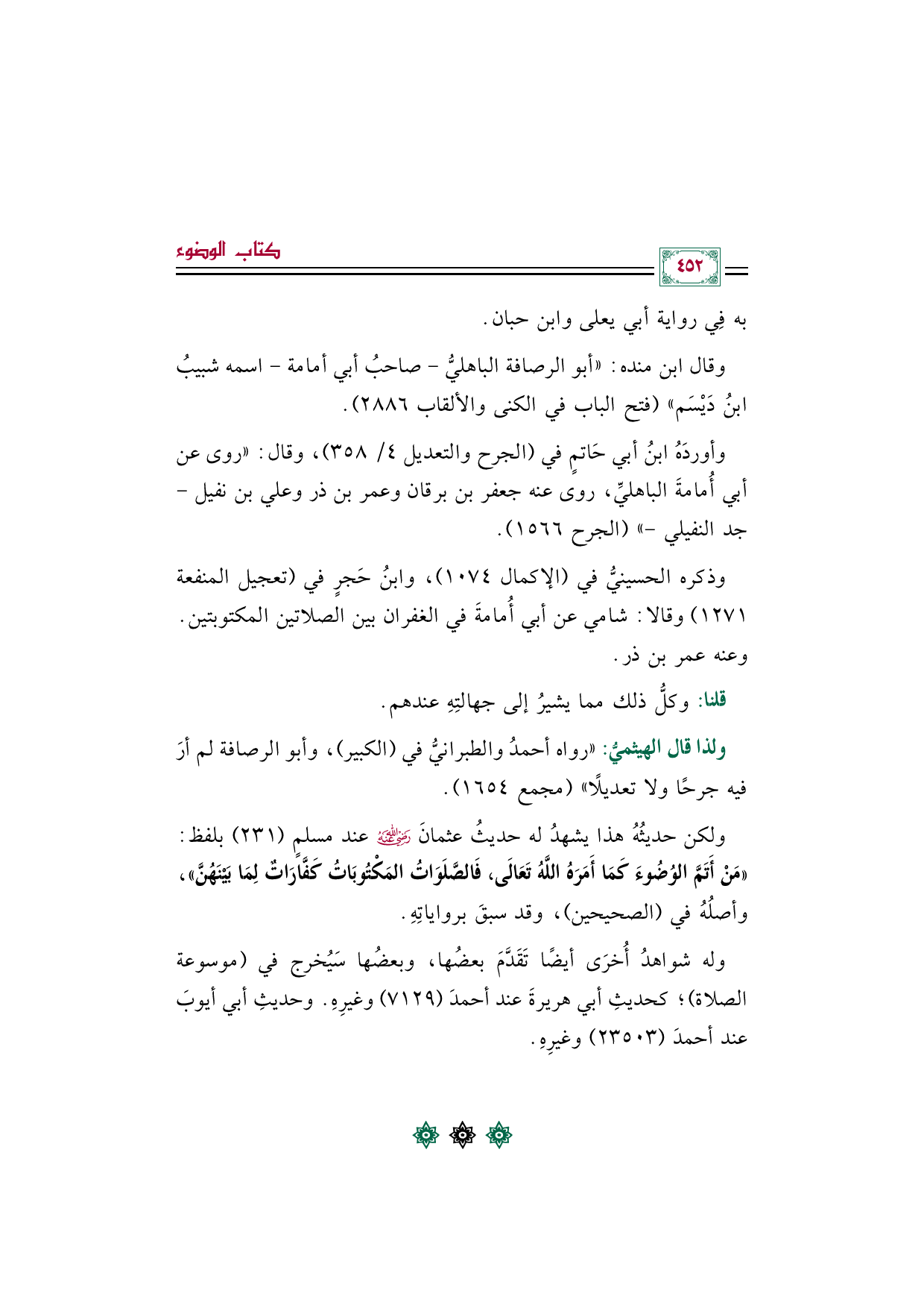 ولذا قال الهيثميُّ: ((رواه أحمدُ والطبرانيُّ في (الكبير)، وأبو الرصافة لم أرَ فيه جرحًا ولا تعديلًا)) (مجمع ١٦٥٤).
