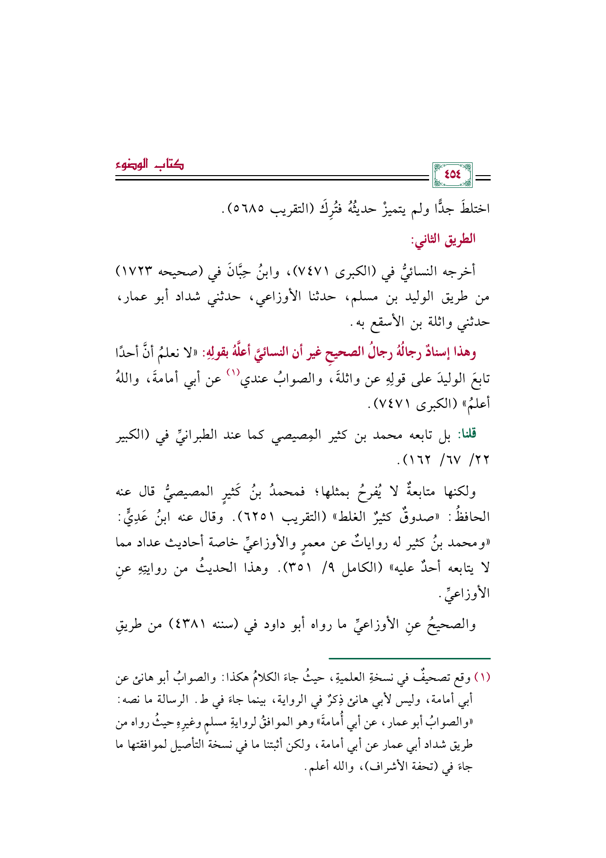(¬١) وقع تصحيفٌ في نسخةِ العلميةِ، حيثُ جاءَ الكلامُ هكذا: "والصوابُ أبو هانئ عن أبي أمامة، وليس لأبي هانئ ذِكرٌ في الرواية، بينما جاءَ في ط. الرسالة ما نصه: "والصوابُ أبو عمار، عن أبي أُمامةَ" وهو الموافقُ لروايةِ مسلمٍ وغيرِهِ حيثُ رواه من طريق شداد أبي عمار عن أبي أمامة، ولكن أثبتنا ما في نسخة التأصيل لموافقتها ما جاءَ في (تحفة الأشراف)، والله أعلم.