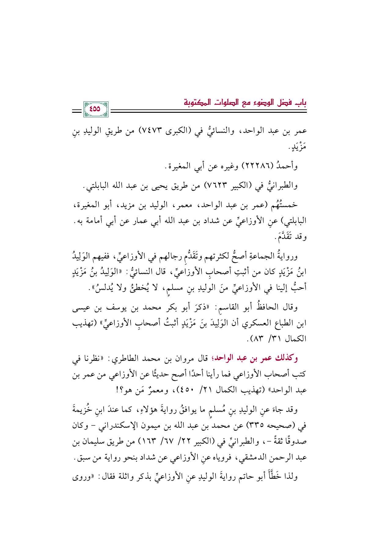 خمستُهُم (عمر بن عبد الواحد، معمر، الوليد بن مزيد، أبو المغيرة، البابلتي) عنِ الأوزاعيِّ عن شداد بن عبد الله أبي عمار عن أبي أمامة به. وقد تَقَدَّمَ.