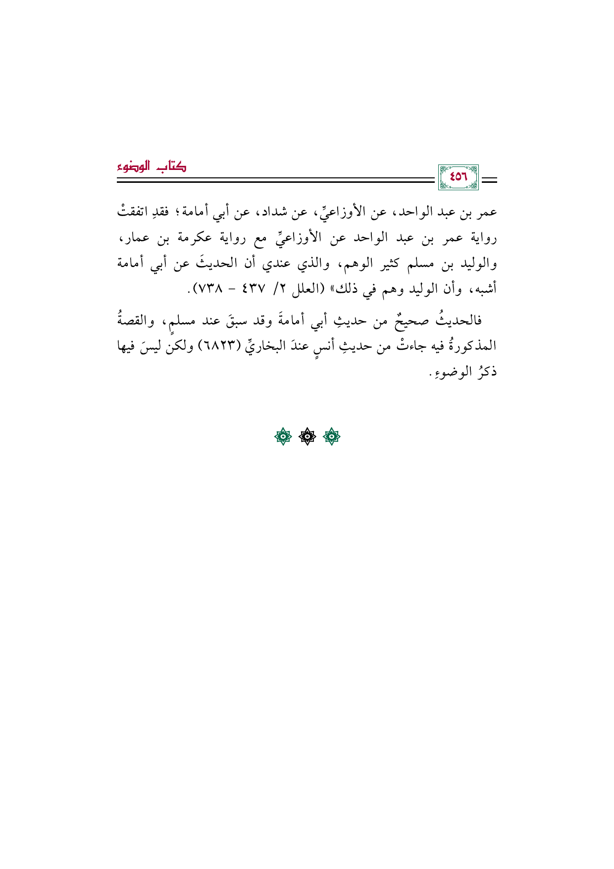 عمر بن عبد الواحد، عن الأوزاعيِّ، عن شداد، عن أبي أمامة؛ فقدِ اتفقتْ رواية عمر بن عبد الواحد عن الأوزاعيِّ مع رواية عكرمة بن عمار، والوليد بن مسلم كثير الوهم، والذي عندي أن الحديثَ عن أبي أمامة أشبه، وأن الوليد وهم في ذلك" (العلل ٢/ ٤٣٧ - ٧٣٨).