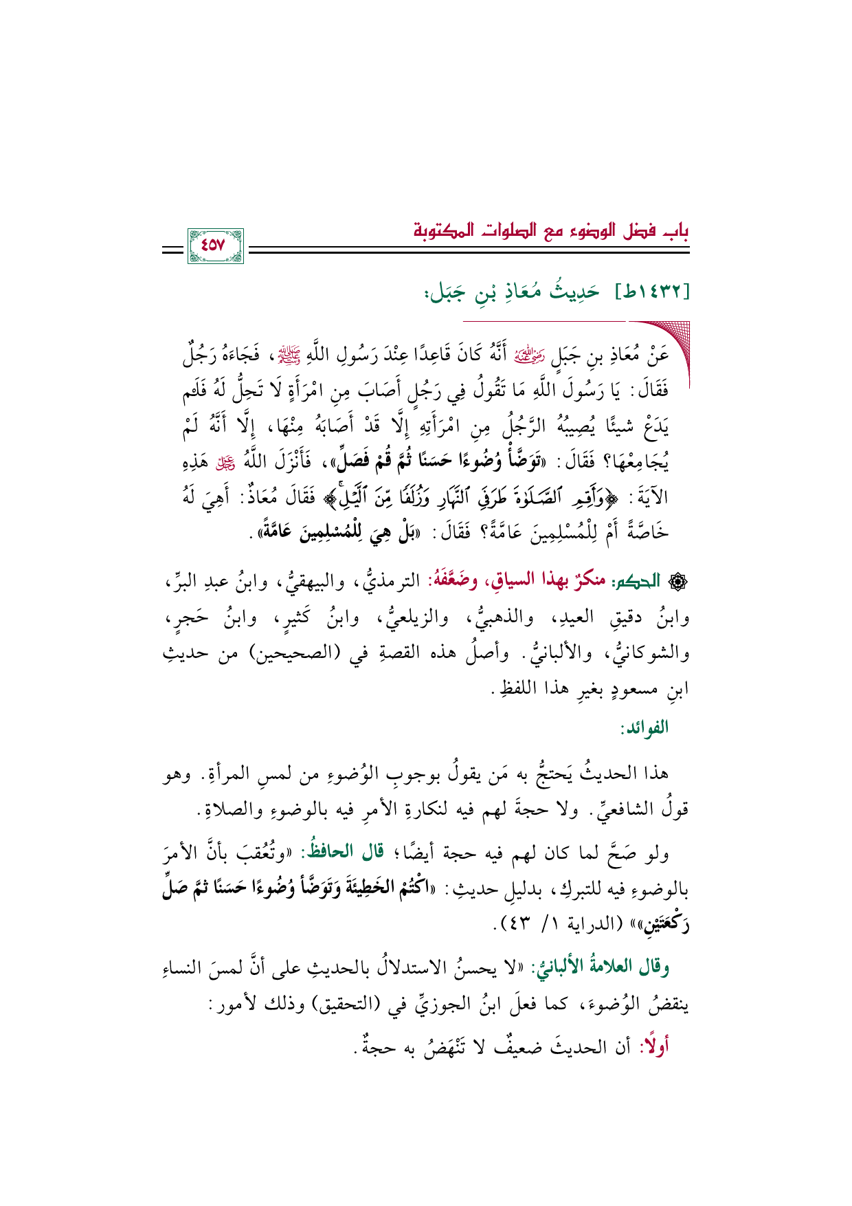 هذا الحديثُ يَحتجُّ به مَن يقولُ بوجوبِ الوُضوءِ من لمسِ المرأةِ. وهو قولُ الشافعيِّ. ولا حجةَ لهم فيه لنكارةِ الأمرِ فيه بالوضوءِ والصلاةِ.