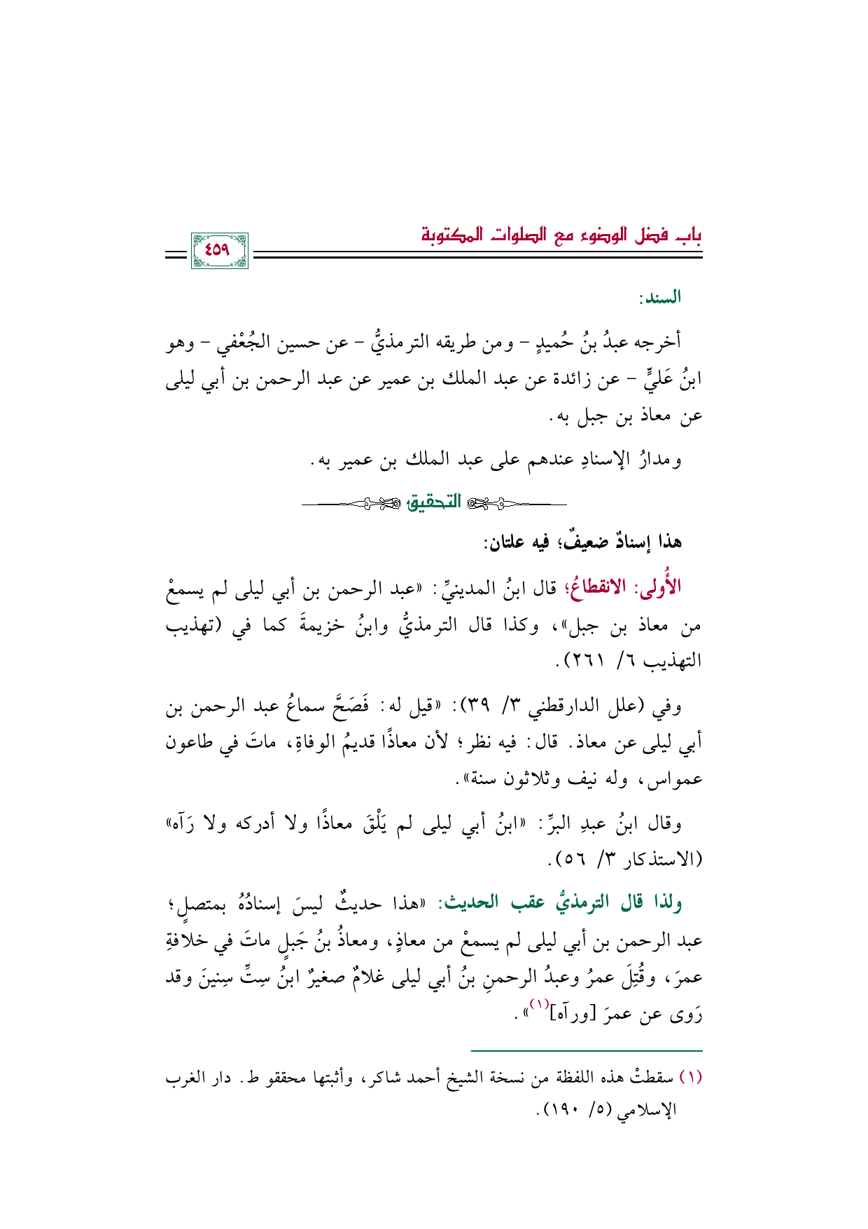ولذا قال الترمذيُّ عقب الحديث: "هذا حديثٌ ليسَ إسنادُهُ بمتصلٍ؛ عبد الرحمن بن أبي ليلى لم يسمعْ من معاذٍ، ومعاذُ بنُ جَبلٍ ماتَ في خلافةِ عمرَ، وقُتِلَ عمرُ وعبدُ الرحمنِ بنُ أبي ليلى غلامٌ صغيرٌ ابنُ سِتِّ سِنينَ وقد رَوى عن عمرَ [ورآه] (¬١) ".