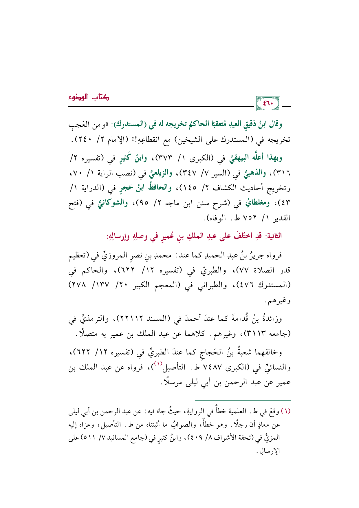 وقال ابنُ دَقيقٍ العيدِ مُتعقبًا الحاكمُ تخريجه له في (المستدرك): "ومن العَجبِ تخريجه في (المستدرك على الشيخين) مع انقطاعِهِ! " (الإمام ٢/ ٢٤٠).