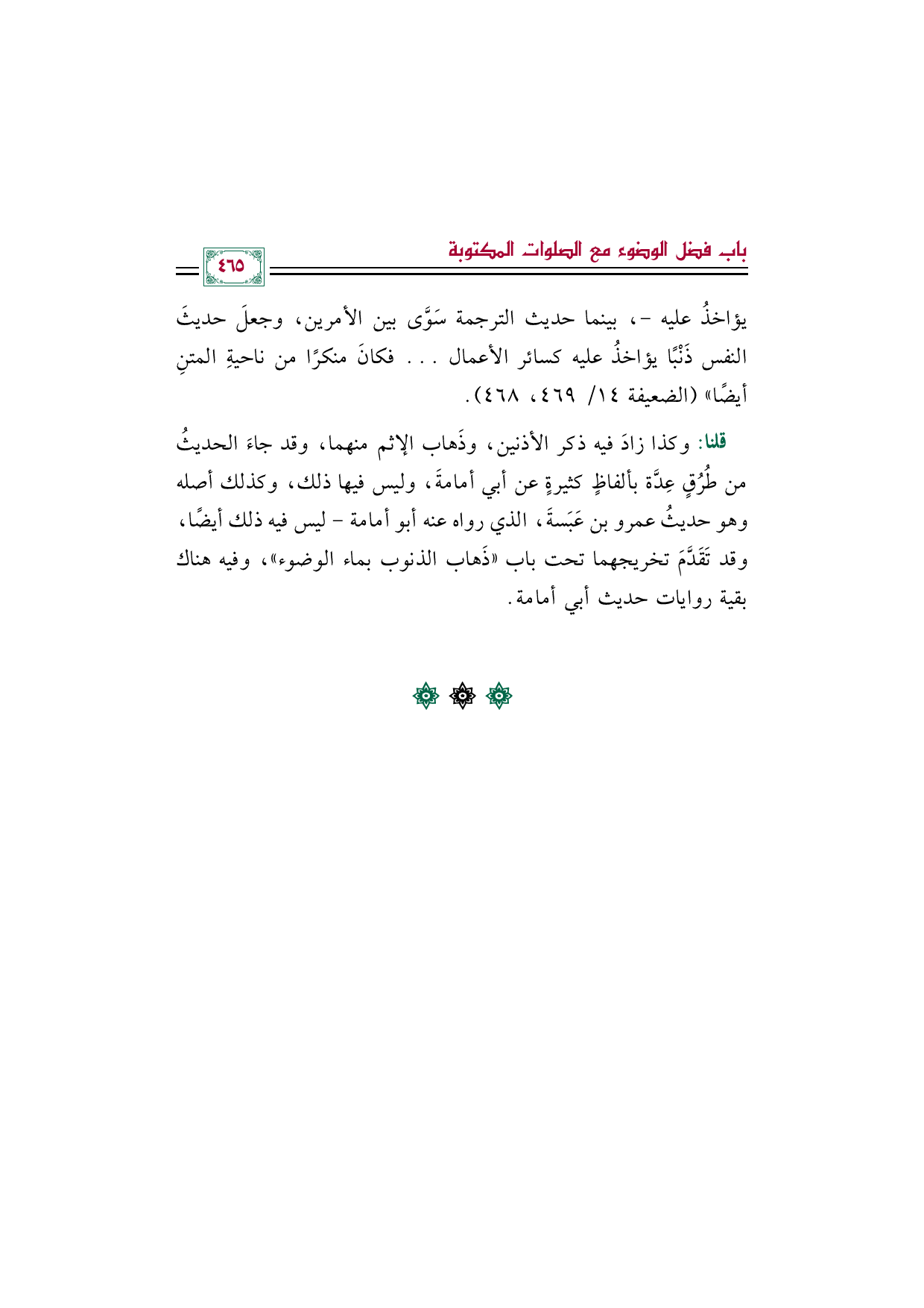 قلنا: وكذا زادَ فيه ذكر الأذنين، وذَهاب الإثم منهما، وقد جاءَ الحديثُ من طُرُقٍ عِدَّة بألفاظٍ كثيرةٍ عن أبي أمامةَ، وليس فيها ذلك، وكذلك أصله وهو حديثُ عمرو بن عَبَسةَ، الذي رواه عنه أبو أمامة- ليس فيه ذلك أيضًا، وقد تَقَدَّمَ تخريجهما تحت باب "ذَهاب الذنوب بماء الوضوء"، وفيه هناك بقية روايات حديث أبي أمامة.