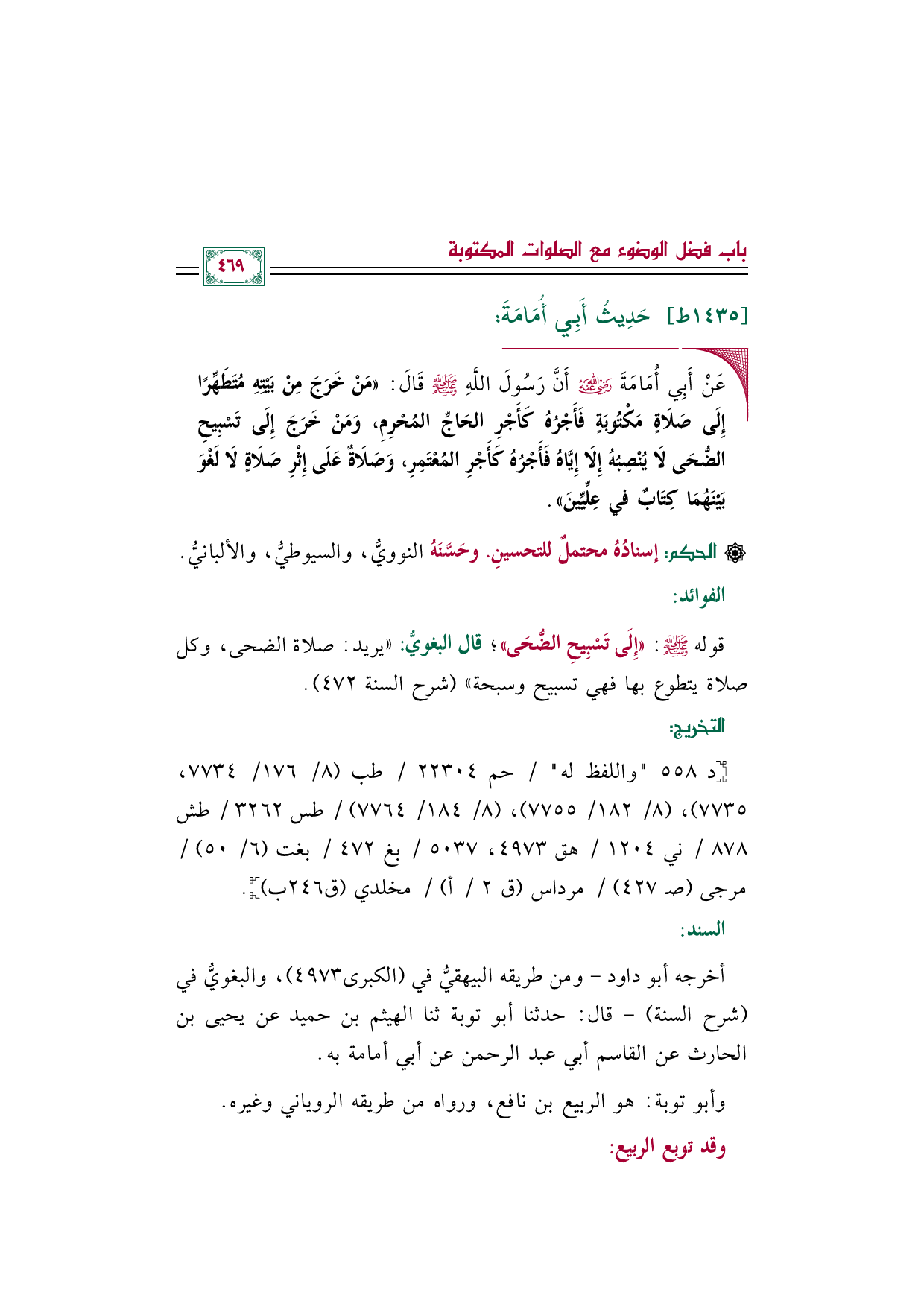 ◼ عَنْ أَبِي أُمَامَةَ رضي الله عنه أَنَّ رَسُولَ اللَّهِ صلى الله عليه وسلم قَالَ: «مَنْ خَرَجَ مِنْ بَيْتِهِ مُتَطَهِّرًا إِلَى صَلَاةٍ مَكْتُوبَةٍ فَأَجْرُهُ كَأَجْرِ الحَاجِّ المُحْرِمِ، وَمَنْ خَرَجَ إِلَى تَسْبِيحِ الضُّحَى لَا يُنْصِبُهُ إِلَا إِيَّاهُ فَأَجْرُهُ كَأَجْرِ المُعْتَمِرِ، وَصَلَاةٌ عَلَى إِثْرِ صَلَاةٍ لَا لَغْوَ بَيْنَهُمَا كِتَابٌ في عِلِّيِّينَ».