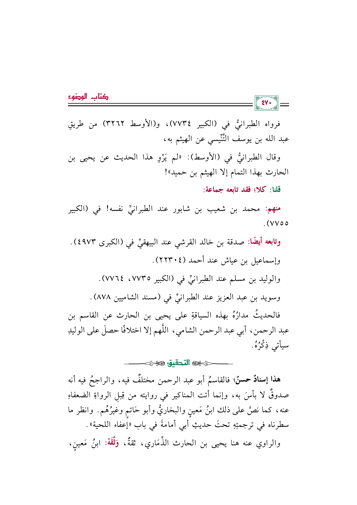 وقال الطبرانيُّ في (الأوسط): "لم يَرْوِ هذا الحديث عن يحيى بن الحارث بهذا التمام إلا الهيثم بن حميد"!