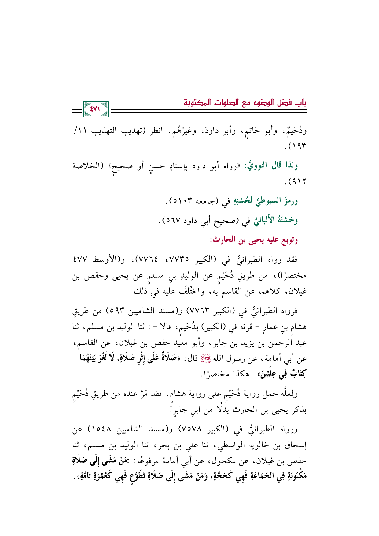ورواه الطبرانيُّ في (الكبير ٧٥٧٨) و (مسند الشاميين ١٥٤٨) عن إسحاق بن خالويه الواسطي، ثنا علي بن بحر، ثنا الوليد بن مسلم، ثنا حفص بن غيلان، عن مكحول، عن أبي أمامة مرفوعًا: «مَنْ مَشَى إِلَى صَلَاةٍ مَكْتُوبَةٍ فِي الجَمَاعَةِ فَهِي كَحَجَّةٍ، وَمَنْ مَشَى إِلَى صَلَاةِ تَطَوُّعٍ فَهِي كَعُمْرَةٍ تَامَّةٍ».