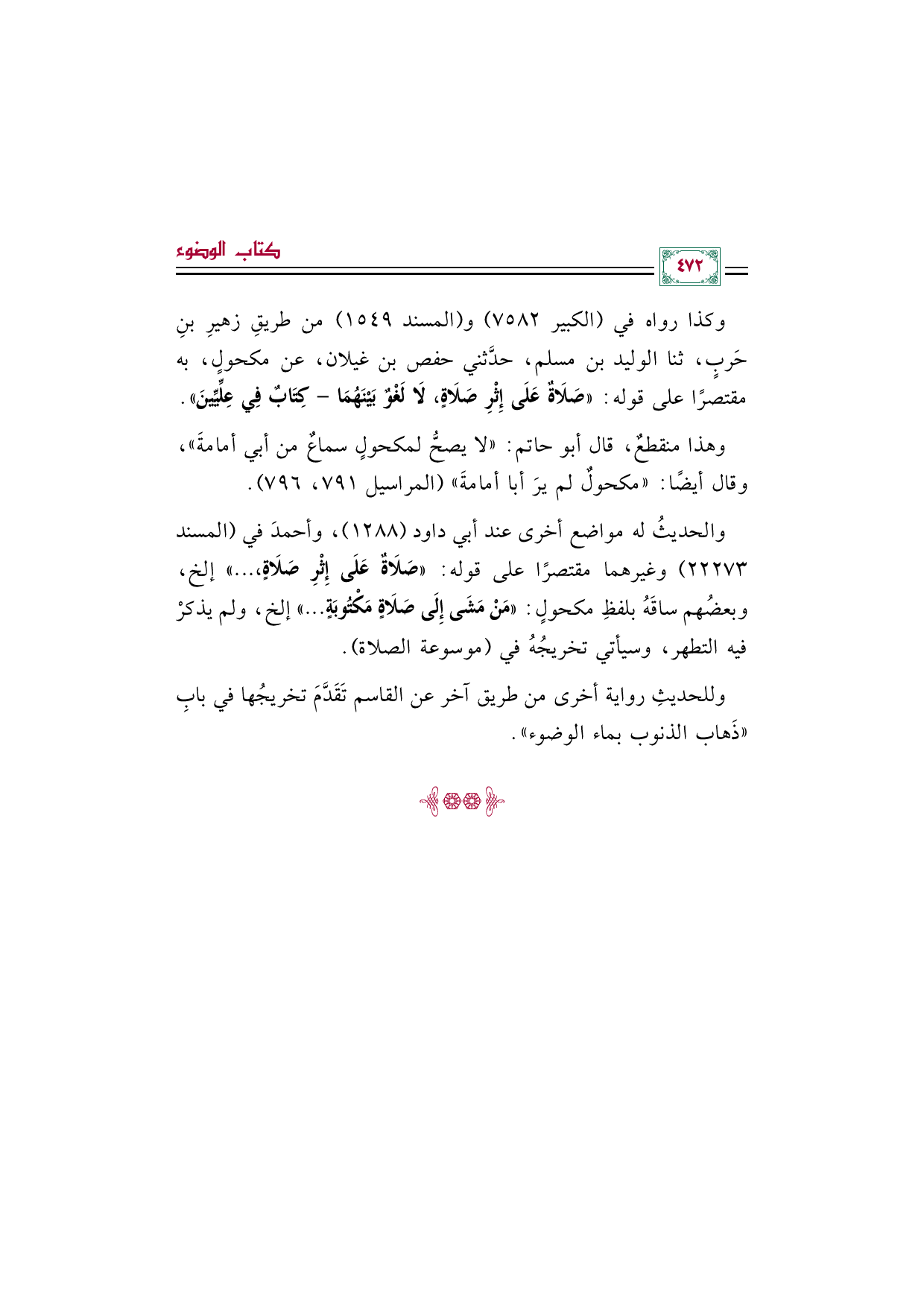 والحديثُ له مواضع أخرى عند أبي داود (١٢٨٨)، وأحمدَ في (المسند ٢٢٢٧٣) وغيرهما مقتصرًا على قوله: «صَلَاةٌ عَلَى إِثْرِ صَلَاةٍ، ... » إلخ، وبعضُهم ساقَهُ بلفظِ مكحولٍ: «مَنْ مَشَى إِلَى صَلَاةٍ مَكْتُوبَةٍ ... » إلخ، ولم يذكرْ فيه التطهر، وسيأتي تخريجُهُ في (موسوعة الصلاة).