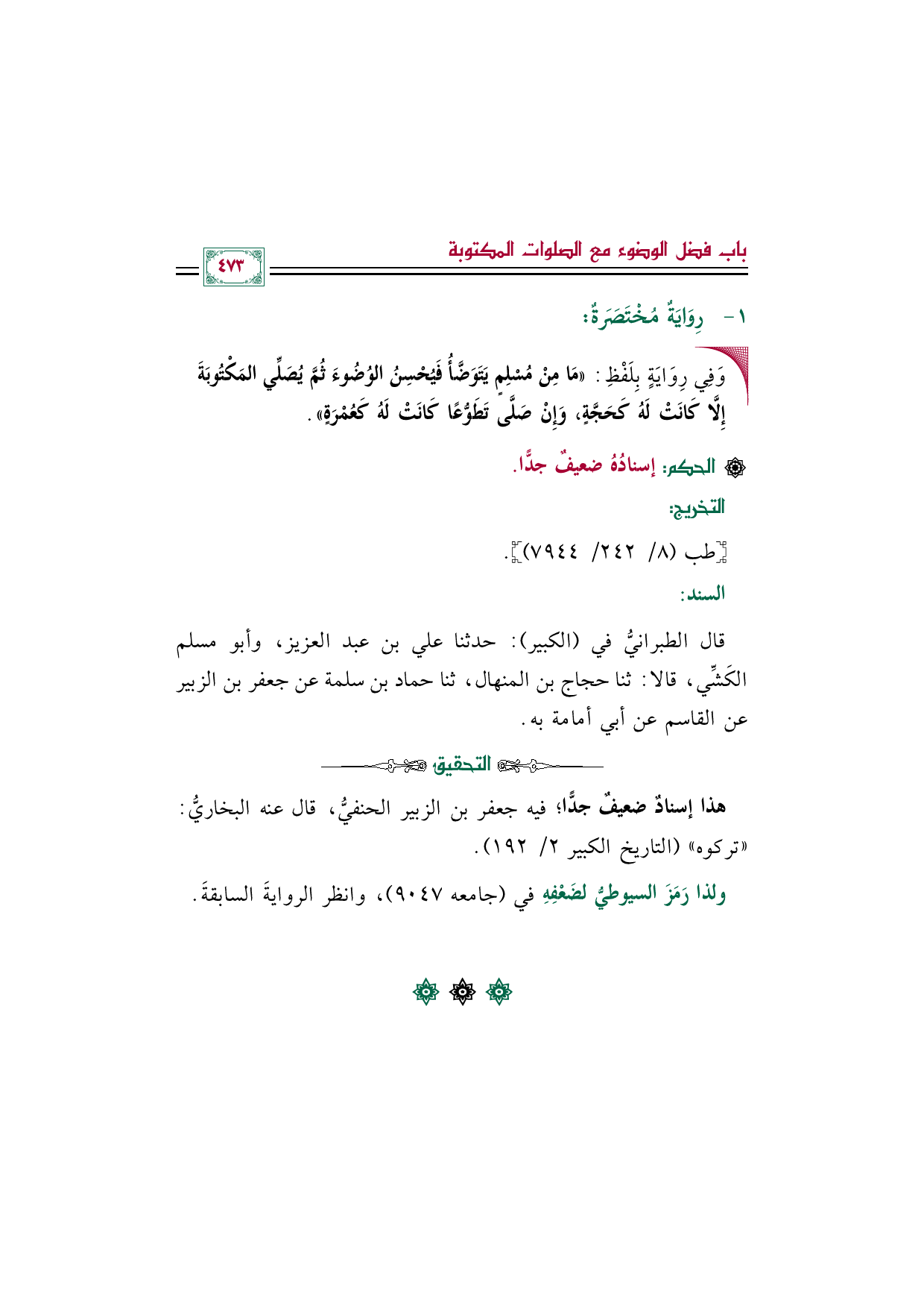قال الطبرانيُّ في (الكبير): حدثنا علي بن عبد العزيز، وأبو مسلم الكَشِّي، قالا: ثنا حجاج بن المنهال، ثنا حماد بن سلمة عن جعفر بن الزبير عن القاسم عن أبي أمامة به.