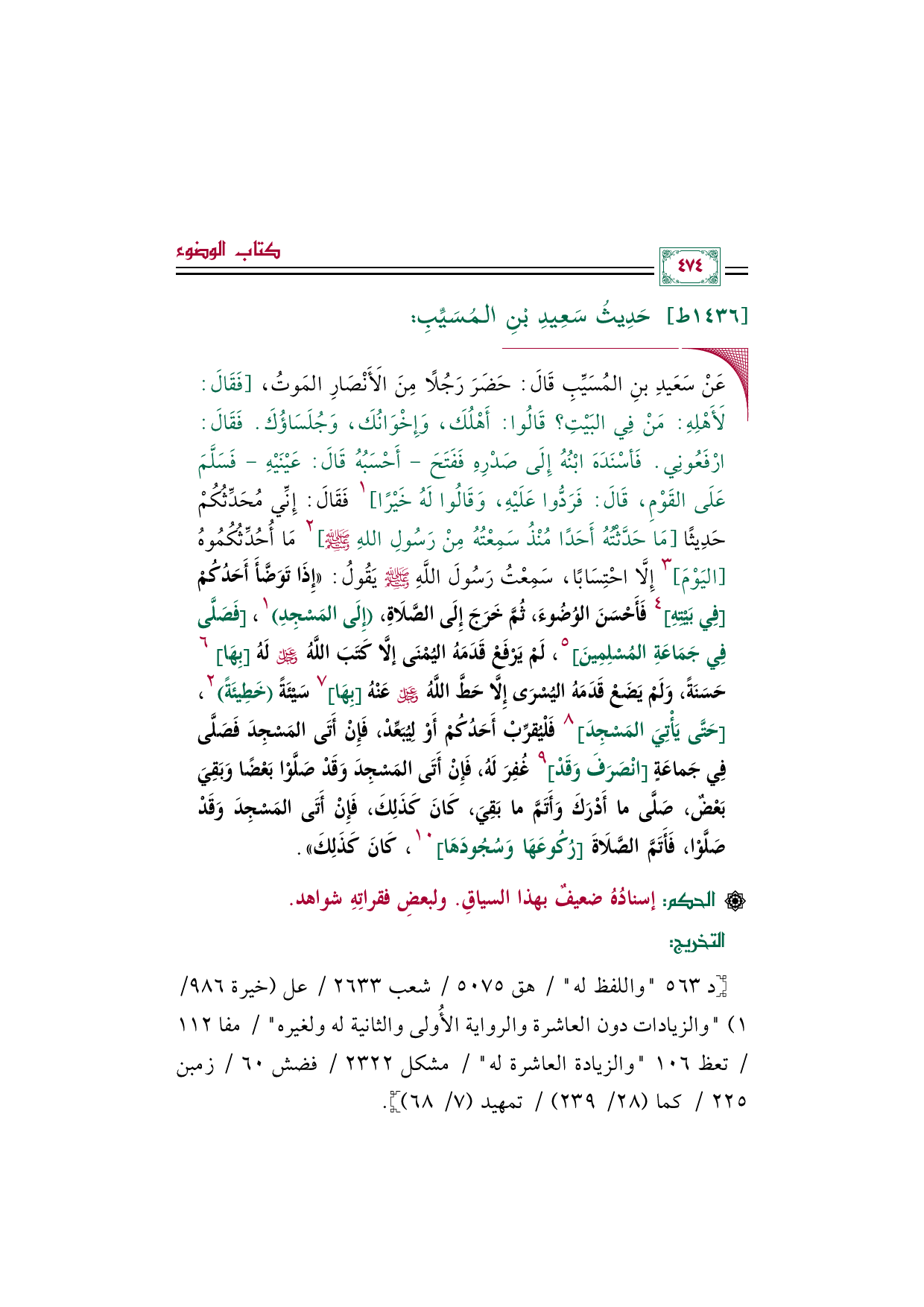 ◼ عَنْ سَعَيدِ بنِ المُسَيِّبِ قَالَ: حَضَرَ رَجُلًا مِنَ الَأَنْصَارِ المَوتُ، [فَقَالَ: لَأَهْلِهِ: مَنْ فِي البَيْتِ؟ قَالُوا: أَهْلُكَ، وَإِخْوَانُكَ، وَجُلَسَاؤُكَ. فَقَالَ: ارْفَعُونِي. فَأسْنَدَهَ ابْنُهُ إِلَى صَدْرِهِ فَفَتَحَ -أَحْسَبُهُ قَالَ: عَيْنَيْهِ- فَسَلَّمَ عَلَى القَوْمِ، قَالَ: فَرَدُّوا عَلَيْهِ، وَقَالُوا لَهُ خَيْرًا] ١ فَقَالَ: إِنِّي مُحَدِّثُكُمْ حَدِيثًا [مَا حَدَّثْتُهُ أَحَدًا مُنْذُ سَمِعْتُهُ مِنْ رَسُولِ اللهِ صلى الله عليه وسلم] ٢ مَا أُحُدِّثُكُمُوهُ [اليَوْمَ] ٣ إِلَّا احْتِسَابًا، سَمِعْتُ رَسُولَ اللَّهِ صلى الله عليه وسلم يَقُولُ: «إِذَا تَوَضَّأَ أَحَدُكُمْ [فِي بَيْتِهِ] ٤ فَأَحْسَنَ الوُضُوءَ، ثُمَّ خَرَجَ إِلَى الصَّلَاةِ، (إِلَى المَسْجِدِ) ١، [فَصَلَّى فِي جَمَاعَةِ المُسْلِمِينَ] ٥، لَمْ يَرْفَعْ قَدَمَهُ اليُمْنَى إلَّا كَتَبَ اللَّهُ -عَزَّ وَجَلَّ- لَهُ [بِهَا] ٦ حَسَنَةً، وَلَمْ يَضَعْ قَدَمَهُ اليُسْرَى إِلَّا حَطَّ اللَّهُ -عَزَّ وَجَلَّ- عَنْهُ [بِهَا] ٧ سَيْئَةً (خَطِيئَةً) ٢، [حَتَّى يَأْتِيَ المَسْجِدَ] ٨ فَلْيُقرِّبْ أَحَدُكُمْ أَوْ لِيُبَعِّدْ، فَإِنْ أَتَى المَسْجِدَ فَصَلَّى فِي جَماعَةٍ [انْصَرَفَ وَقَدْ] ٩ غُفِرَ لَهُ، فَإِنْ أَتَى المَسْجِدَ وَقَدْ صَلَّوْا بَعْضًا وَبَقِيَ بَعْضٌ، صَلَّى ما أَدْرَكَ وَأَتَمَّ ما بَقِيَ، كَانَ كَذَلِكَ، فَإِنْ أَتَى المَسْجِدَ وَقَدْ صَلَّوْا، فَأَتَمَّ الصَّلَاةَ [رُكُوعَهَا وَسُجُودَهَا] ١٠، كَانَ كَذَلِكَ».