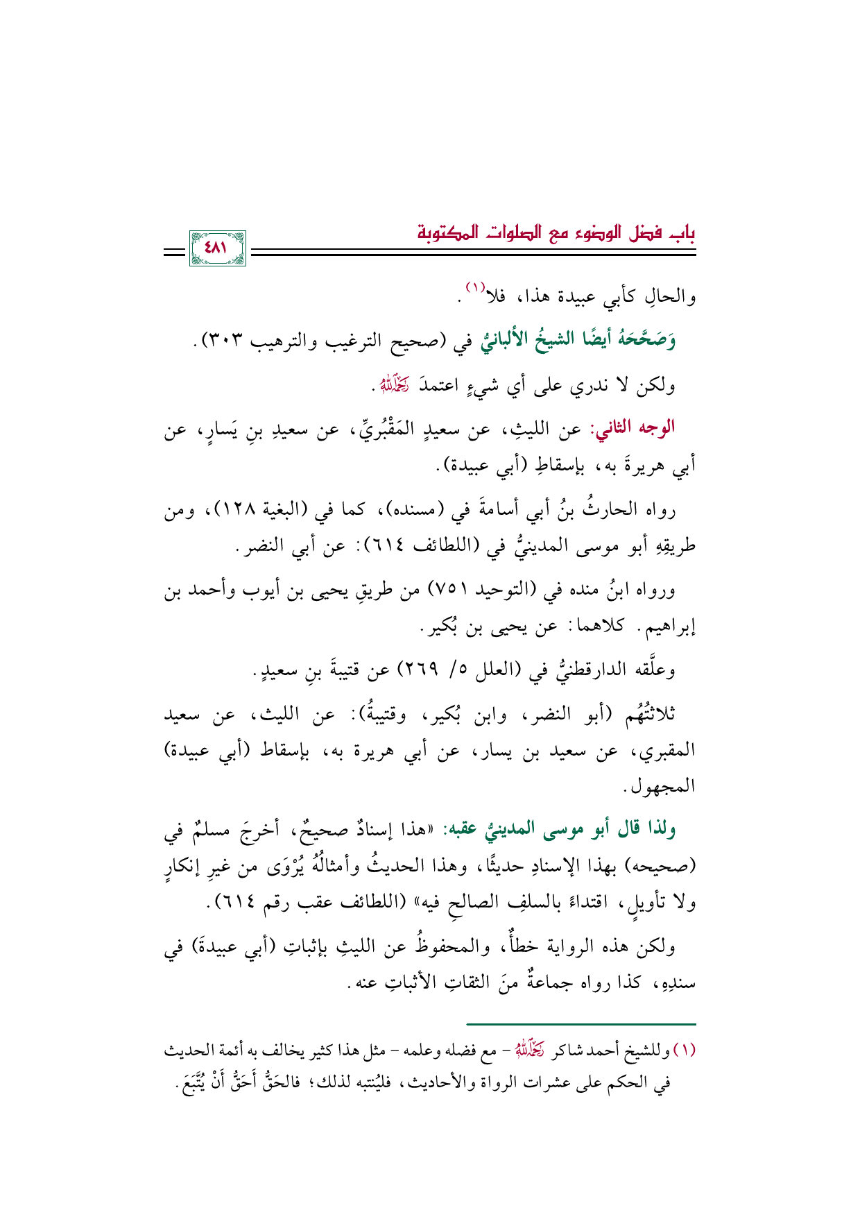ولكن هذه الرواية خطأٌ، والمحفوظُ عن الليثِ بإثباتِ (أبي عبيدةَ) في سندِهِ، كذا رواه جماعةٌ منَ الثقاتِ الأثباتِ عنه.