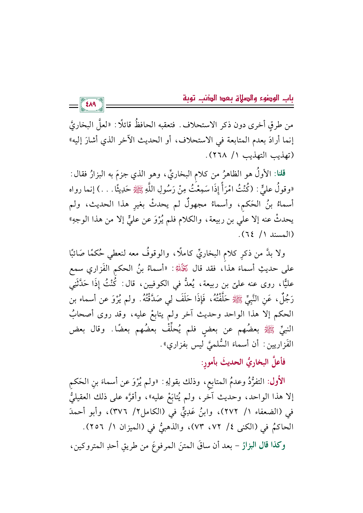 قلنا: الأولُ هو الظاهرُ من كلامِ البخاريِّ، وهو الذي جزمَ به البزارُ فقال: "وقولُ عليٍّ: (كُنْتُ امْرَأً إِذَا سَمِعْتُ مِنْ رَسُولِ اللَّهِ صلى الله عليه وسلم حَدِيثًا ... ) إنما رواه أسماءُ بنُ الحَكمِ، وأسماءُ مجهولٌ لم يحدثْ بغيرِ هذا الحديث، ولم يحدثْ عنه إلا علي بن ربيعة، والكلام فلم يُرْوَ عن عليٍّ إلا من هذا الوجهِ" (المسند ١/ ٦٤).