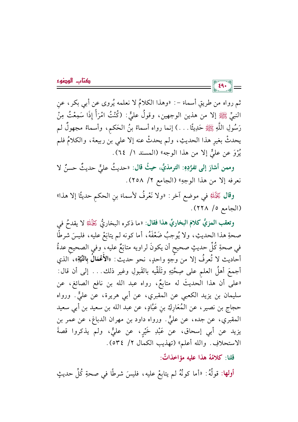 ثم رواه من طريقِ أسماءَ-: "وهذا الكلامُ لا نعلمه يُروى عن أبي بكر، عنِ النبيِّ صلى الله عليه وسلم إلا من هذين الوجهين، وقولُ عليٍّ: (كُنْتُ امْرَأً إِذَا سَمِعْتُ مِنْ رَسُولِ اللَّهِ صلى الله عليه وسلم حَدِيثًا ... ) إنما رواه أسماءُ بنُ الحَكمِ، وأسماءُ مجهولٌ لم يحدثْ بغيرِ هذا الحديثِ، ولم يحدثْ عنه إلا علي بن ربيعة، والكلامُ فلم يُرْوَ عن عليٍّ إلا من هذا الوجه" (المسند ١/ ٦٤)