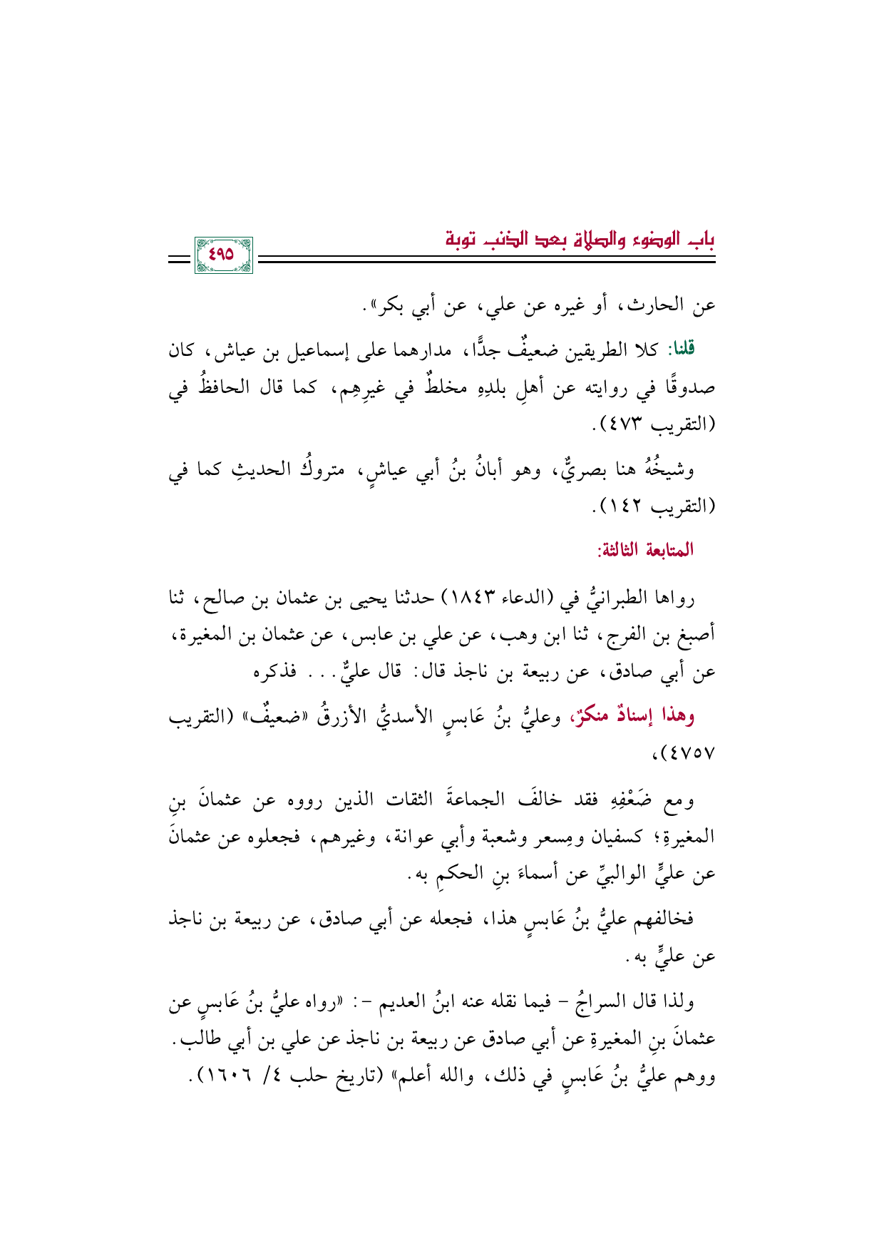 ولذا قال السراجُ -فيما نقله عنه ابنُ العديم-: "رواه عليُّ بنُ عَابسٍ عن عثمانَ بنِ المغيرةِ عن أبي صادق عن ربيعة بن ناجذ عن علي بن أبي طالب. ووهم عليُّ بنُ عَابسٍ في ذلك، والله أعلم" (تاريخ حلب ٤/ ١٦٠٦).