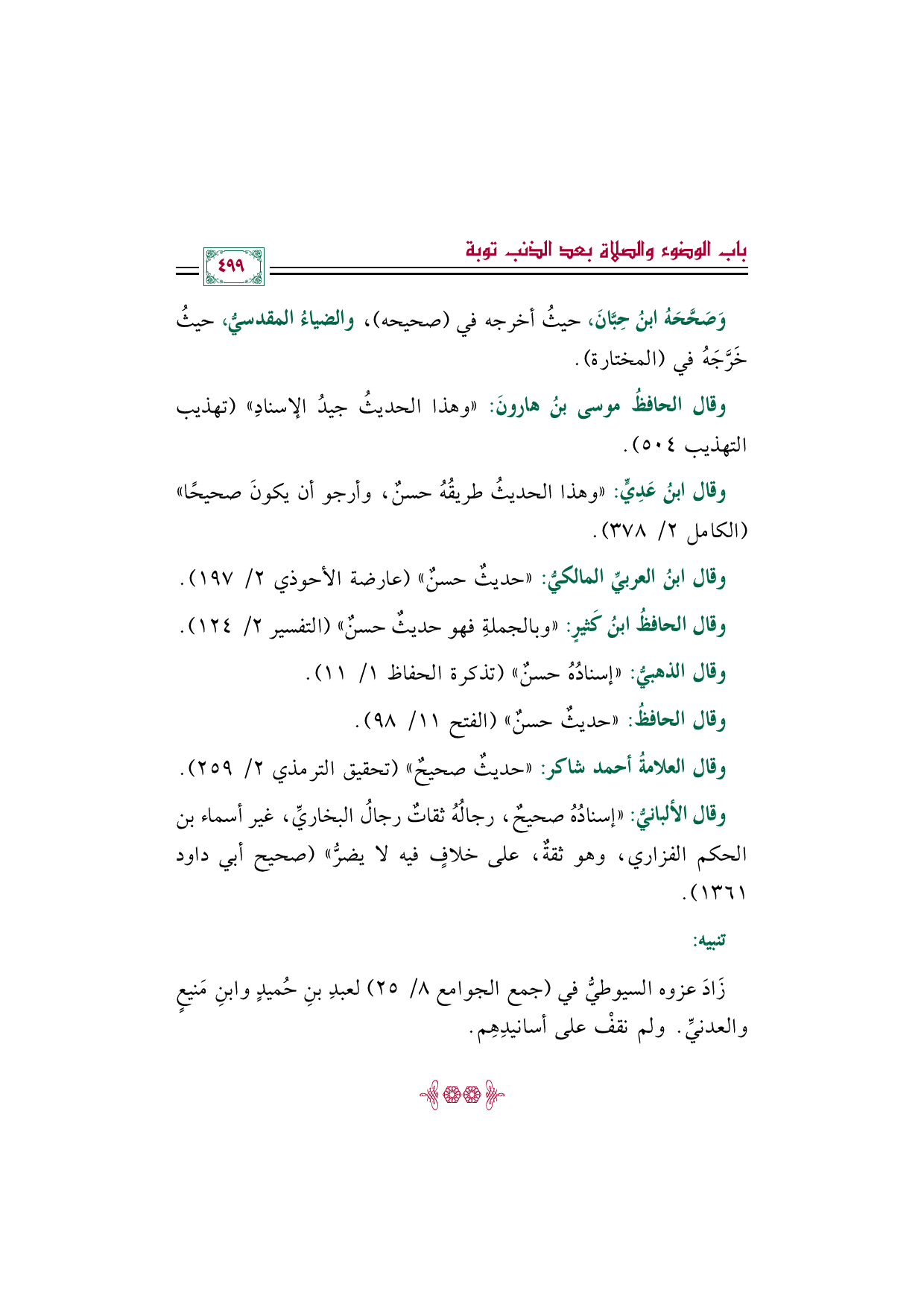 وَصَحَّحَهُ ابنُ حِبَّانَ، حيثُ أخرجه في (صحيحه)، والضياءُ المقدسيُّ، حيثُ خَرَّجَهُ في (المختارة).