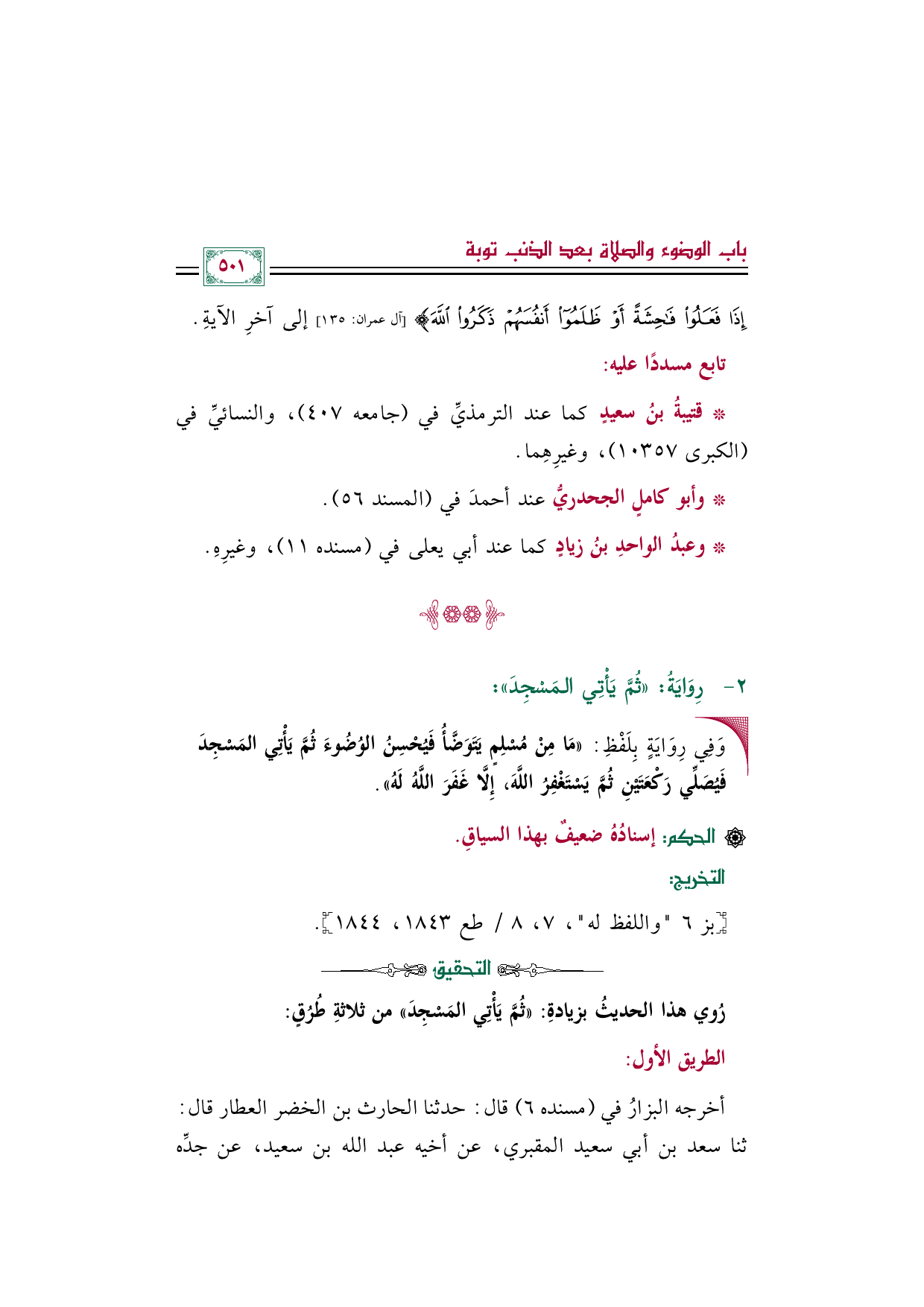 رُوي هذا الحديثُ بزيادةِ: «ثُمَّ يَأْتِي المَسْجِدَ» من ثلاثةِ طُرُقٍ: