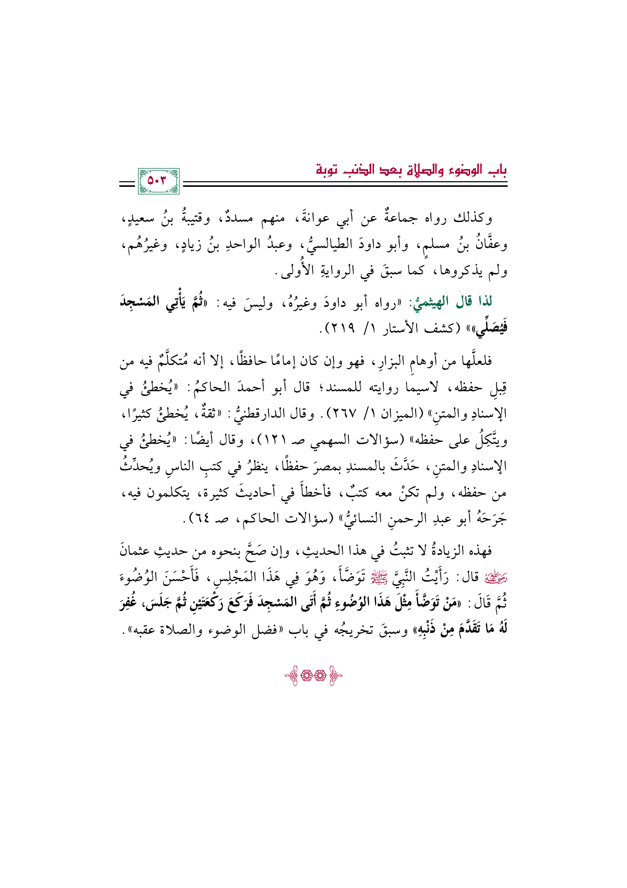 لذا قال الهيثميُّ: "رواه أبو داودَ وغيرُهُ، وليسَ فيه: «ثُمَّ يَأْتِي المَسْجِدَ فَيُصَلِّي» " (كشف الأستار ١/ ٢١٩).