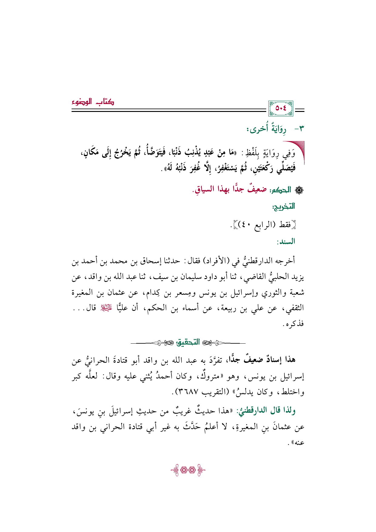 ولذا قال الدارقطنيُّ: "هذا حديثٌ غريبٌ من حديثِ إسرائيلَ بنِ يونسَ، عن عثمانَ بنِ المغيرةِ، لا أعلمُ حَدَّثَ به غير أبي قتادة الحراني بن واقد عنه.