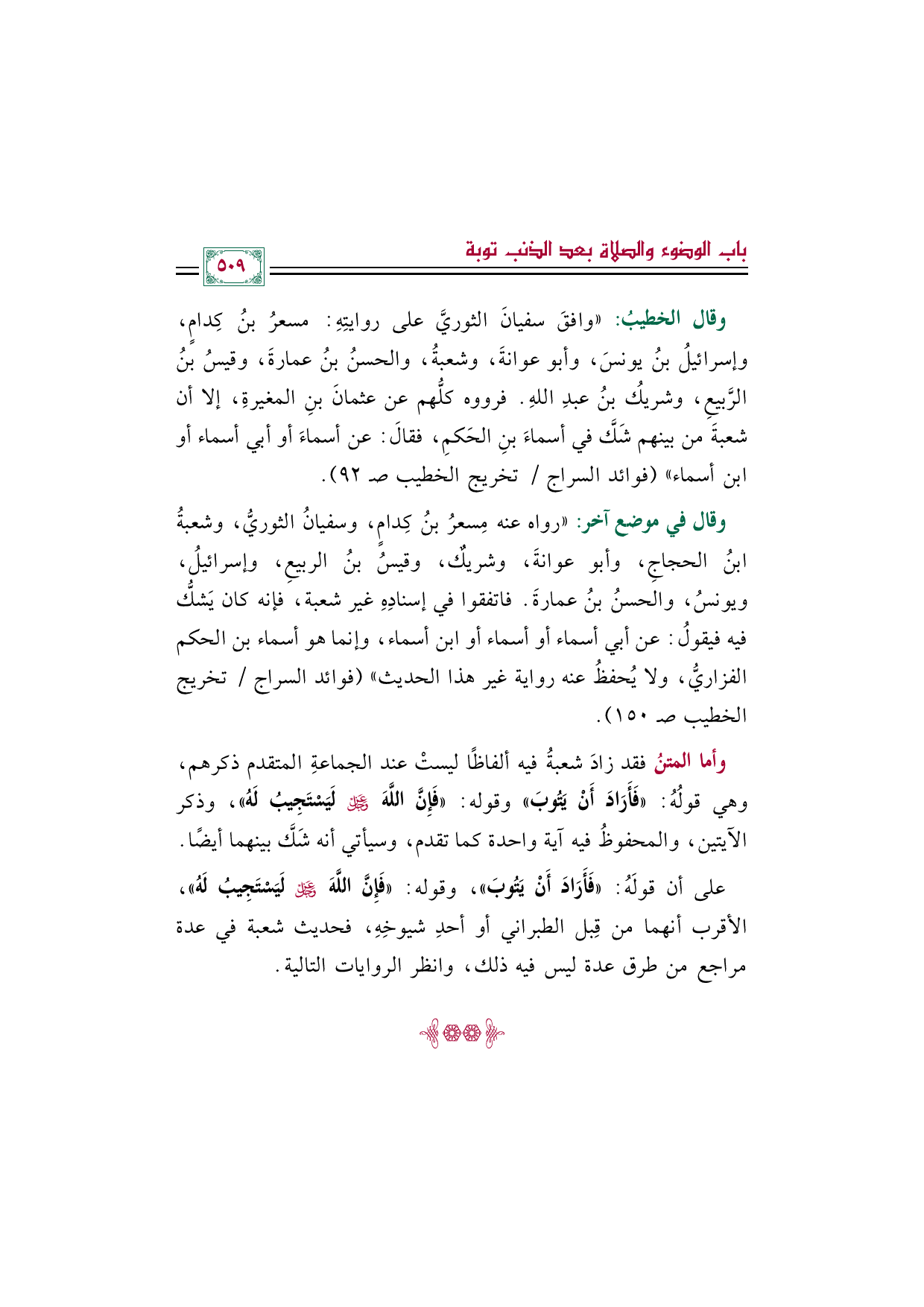 وأما المتنُ فقد زادَ شعبةُ فيه ألفاظًا ليستْ عند الجماعةِ المتقدم ذكرهم، وهي قولُهُ: «فَأَرَادَ أَنْ يَتُوبَ» وقوله: «فَإِنَّ اللَّهَ عَزَّ وَجَلَّ لَيَسْتَجِيبُ لَهُ»، وذكر الآيتين، والمحفوظُ فيه آية واحدة كما تقدم، وسيأتي أنه شَكَّ بينهما أيضًا.