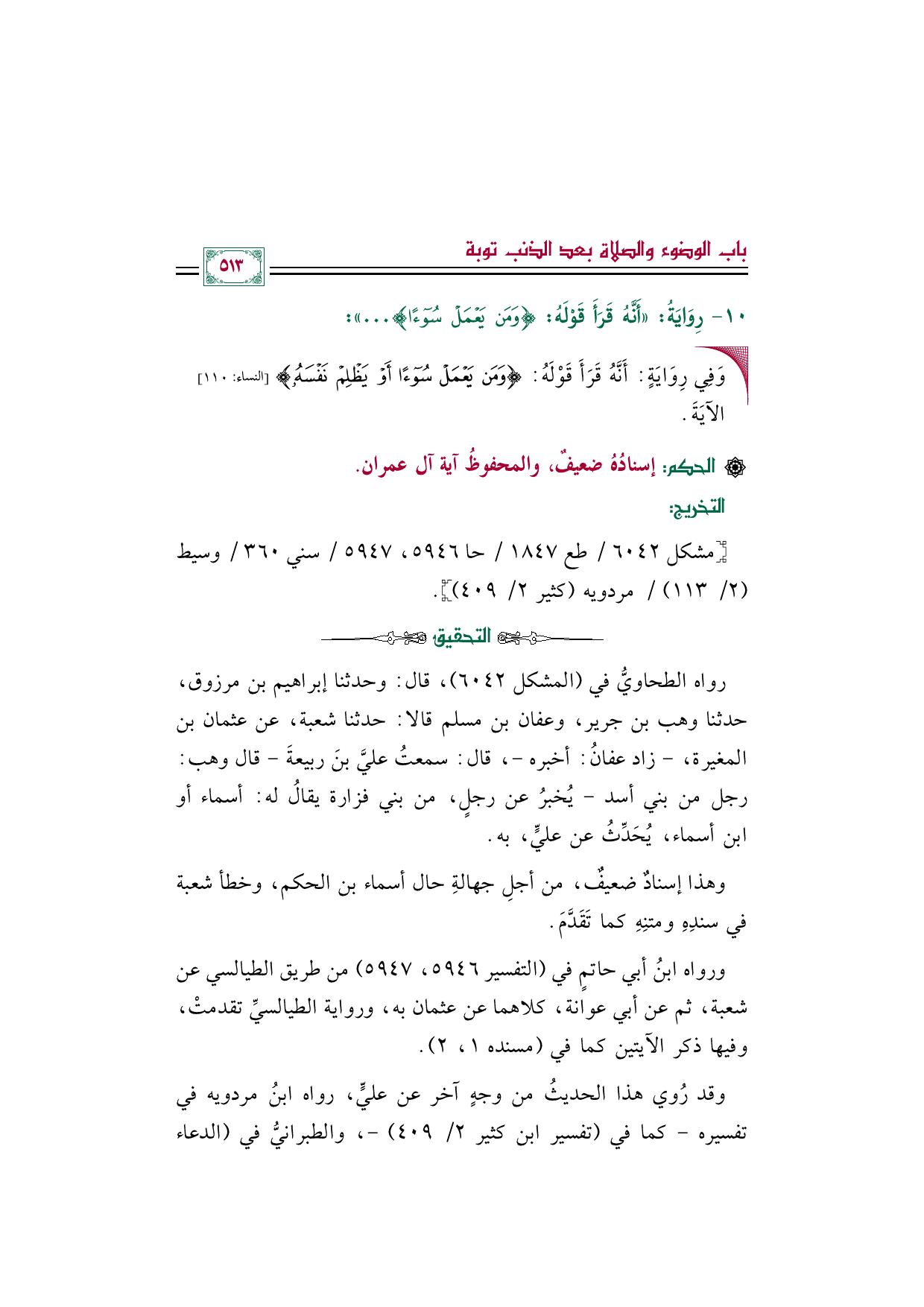 رواه الطحاويُّ في (المشكل ٦٠٤٢)، قال: وحدثنا إبراهيم بن مرزوق، حدثنا وهب بن جرير، وعفان بن مسلم قالا: حدثنا شعبة، عن عثمان بن المغيرة، -زاد عفانُ: أخبره-، قال: سمعتُ عليَّ بنَ ربيعةَ -قال وهب: رجل من بني أسد- يُخبرُ عن رجلٍ، من بني فزارة يقالُ له: أسماء أو ابن أسماء، يُحَدِّثُ عن عليٍّ، به.