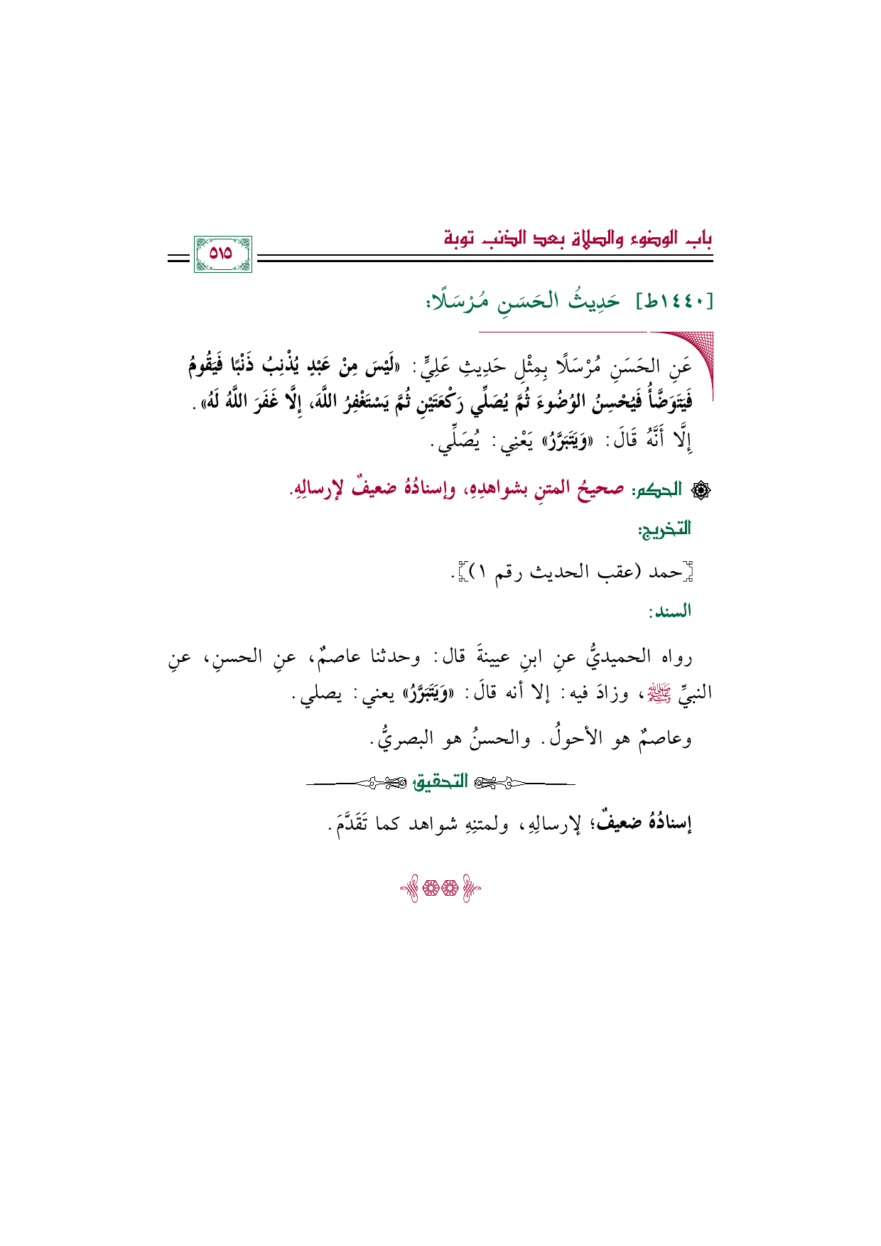 رواه الحميديُّ عنِ ابنِ عيينةَ قال: وحدثنا عاصمٌ، عنِ الحسنِ، عنِ النبيِّ صلى الله عليه وسلم، وزادَ فيه: إلا أنه قالَ: «وَيَتَبَرَّرُ» يعني: يصلي.