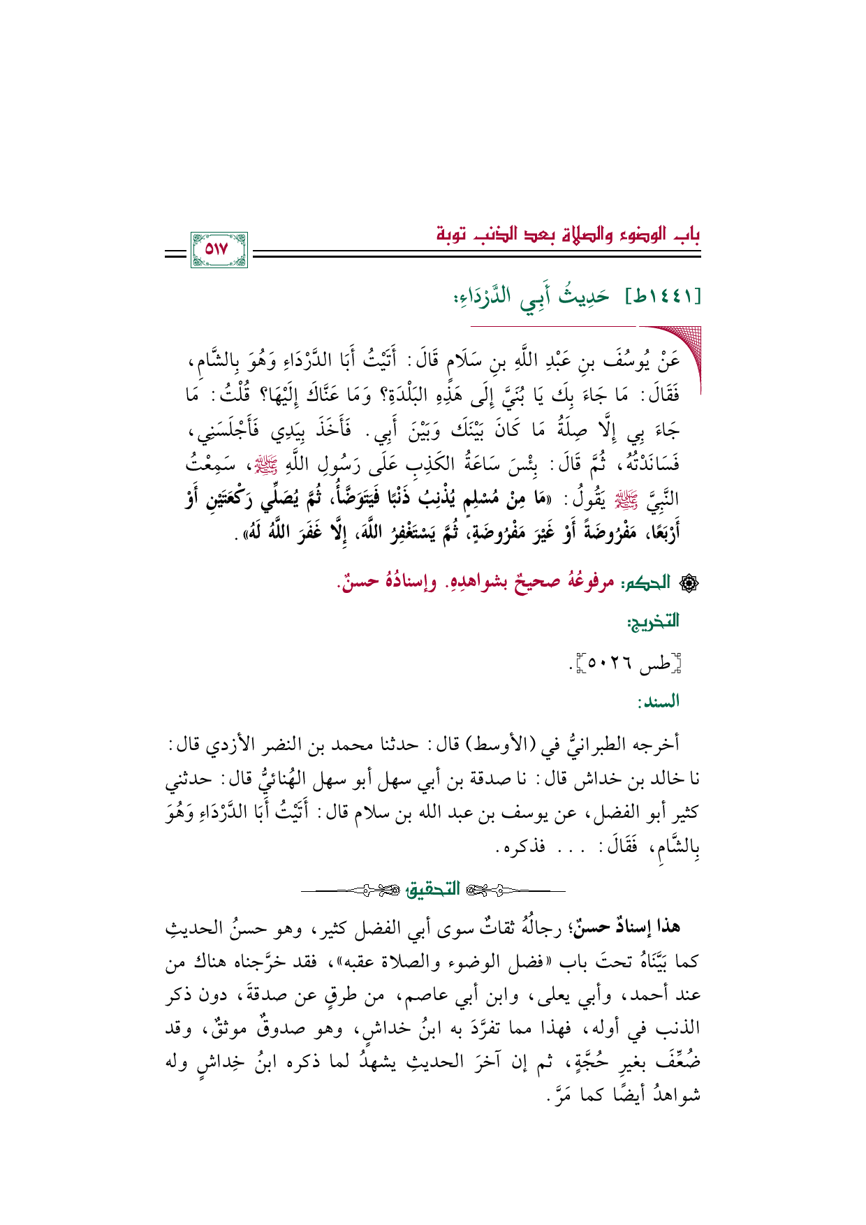 هذا إسنادٌ حسنٌ؛ رجالُهُ ثقاتٌ سوى أبي الفضل كثير، وهو حسنُ الحديثِ كما بَيَّنَاهُ تحتَ باب "فضل الوضوء والصلاة عقبه"، فقد خرَّجناه هناك من عند أحمد، وأبي يعلى، وابن أبي عاصم، من طرقٍ عن صدقةَ، دون ذكر الذنب في أوله، فهذا مما تفرَّدَ به ابنُ خداشٍ، وهو صدوقٌ موثقٌ، وقد ضُعِّفَ بغيرِ حُجَّةٍ، ثم إن آخرَ الحديثِ يشهدُ لما ذكره ابنُ خِداشٍ وله شواهدُ أيضًا كما مَرَّ.